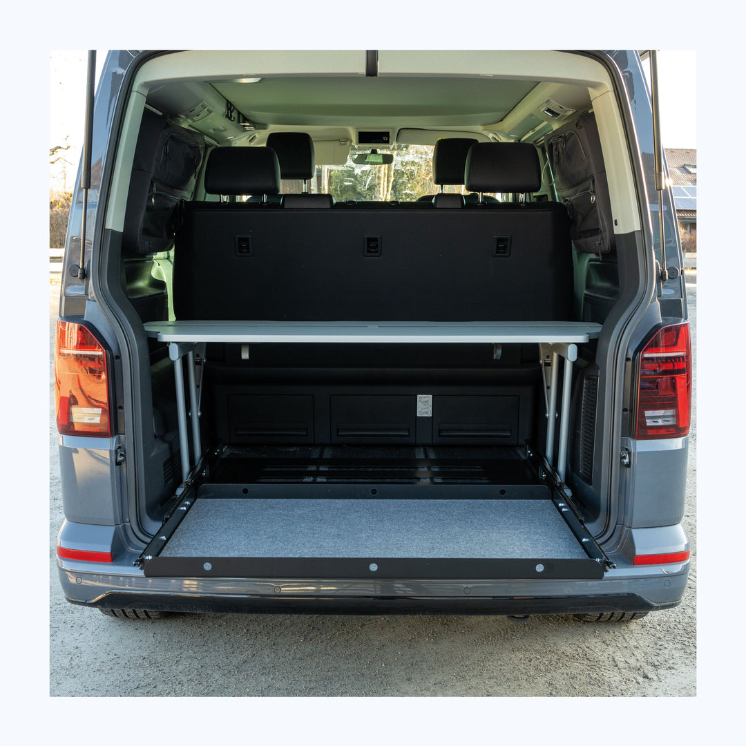 Die modulare Heckküche passt perfekt unter das Original VW Multiflexboard. Der Heckauszug bietet Platz für individuell konfigurierbare Module, Gaskocher, Wasserversorgung und Kompressorkühlbox. Die herausnehm- und stapelbaren Module können auch im Innenraum oder unter der Markise verwendet werden.