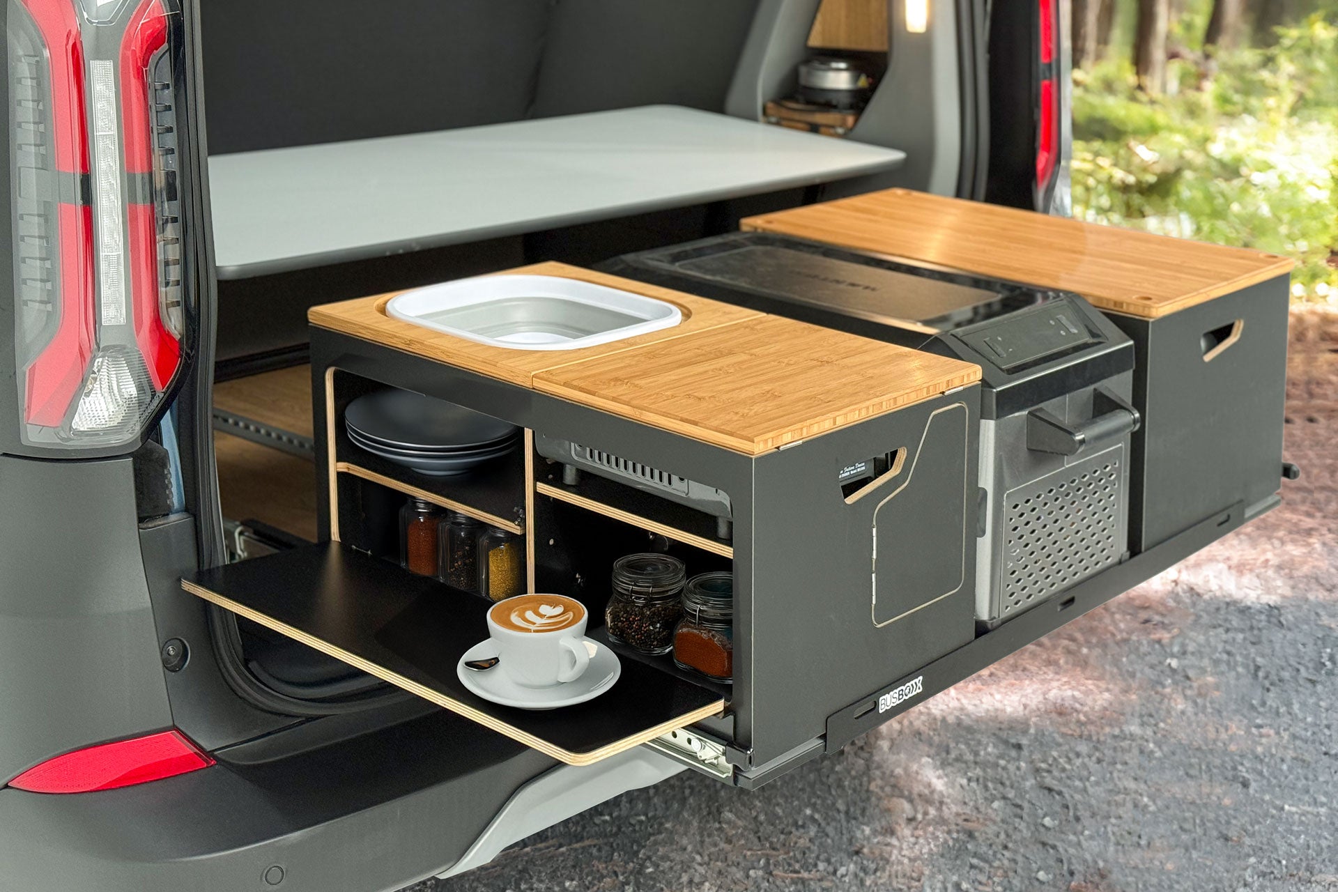 Die modulare Heckküche passt perfekt unter die vanexxt Heckablage in Kombination mit dem vanexxt Heckauszug. Dieser bietet Platz für individuell konfigurierbare Module, Gaskocher, Wasserversorgung und Kompressorkühlbox. Die herausnehmbaren Module können platzsparend verstaut oder als Outdoorküche unter der Markise verwendet werden.