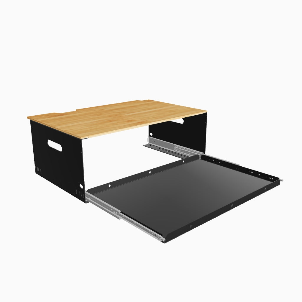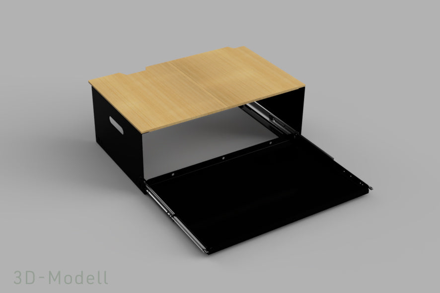 Heckablage Bambus, Seitenteile schwarz, Schwerlast-Heckauszug schwarz mit Filz bezogen, Befestigungsmaterial für Schienensystem. Küchenmodule NICHT im Lieferumfang.