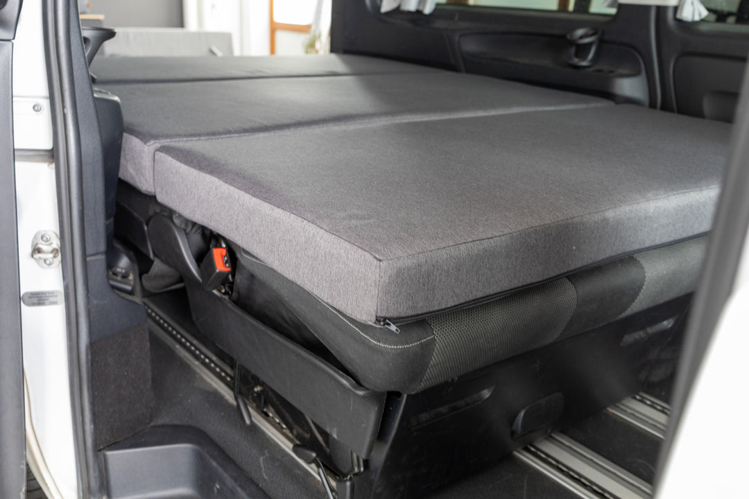 Unsere maßgefertifte dreiteilige Matratze aus Kaltschaum und Viskose gleicht den geringen Höhenunterschied zwischen umgeklappter 3er Rücksitzbank und Heckablage aus und sorgt für höchsten Schlafkomfort. Es entsteht eine ebene Liegefläche.