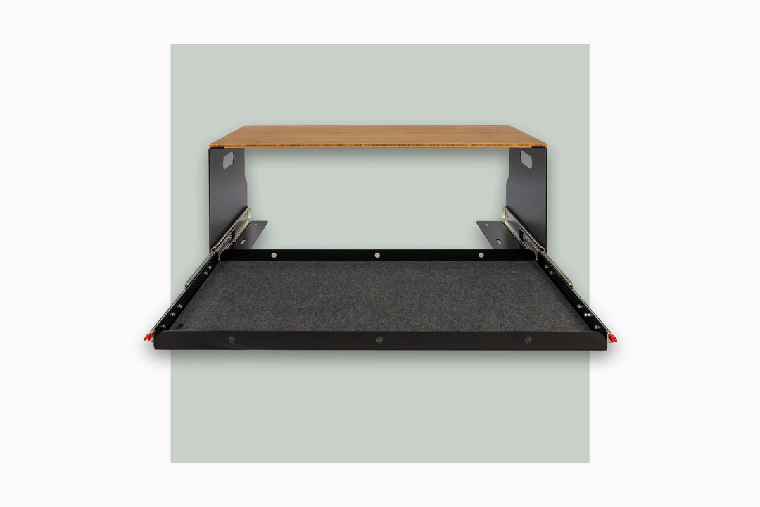 Ein großes Staufach mit Klappe als Ablagefläche, ein Fach für Besteck oder Gaskocher, ein Fach für Abwasserkanister, eine zum Tisch aufklappbare Bambusplatte und Brotzeitbrettl an der Seite. Es sind zwei verschiedene Wasseroptionen möglich. 12V Stromversorgung über komfortable Magnetstecker und Filzeinlagen für klapperfreies Verstauen. Dieses Modul kann man auf auch andere Module stapeln und untereinander bzw. am Schienensystem fixieren.