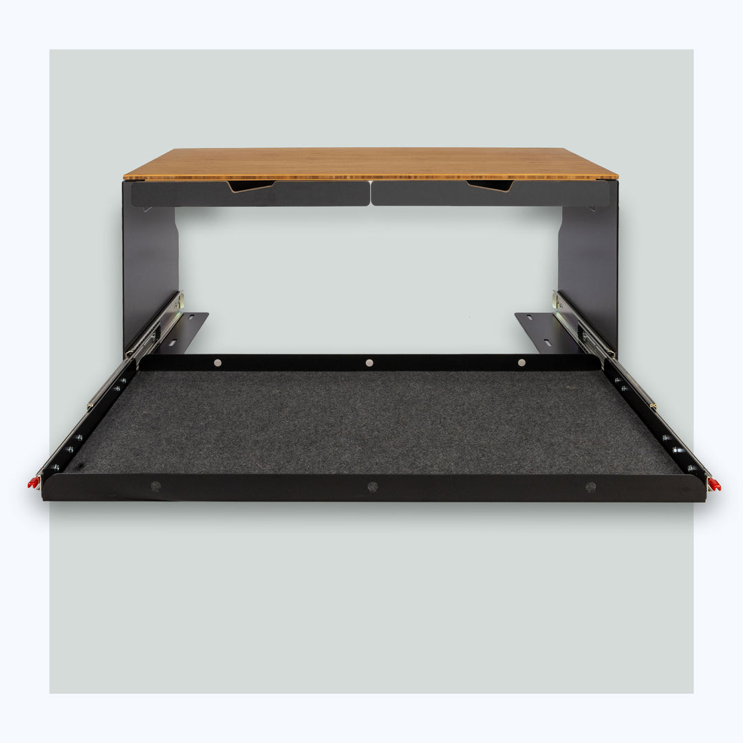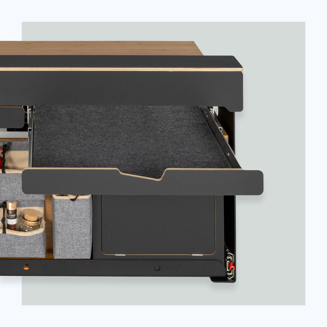 Ein großes Staufach mit Klappe als Ablagefläche, ein Fach für Besteck oder Gaskocher, ein Fach für Abwasserkanister, eine zum Tisch aufklappbare Bambusplatte und Brotzeitbrettl an der Seite. Es sind zwei verschiedene Wasseroptionen möglich. 12V Stromversorgung über komfortable Magnetstecker und Filzeinlagen für klapperfreies Verstauen. Dieses Modul kann man auf auch andere Module stapeln und untereinander bzw. am Schienensystem fixieren.
