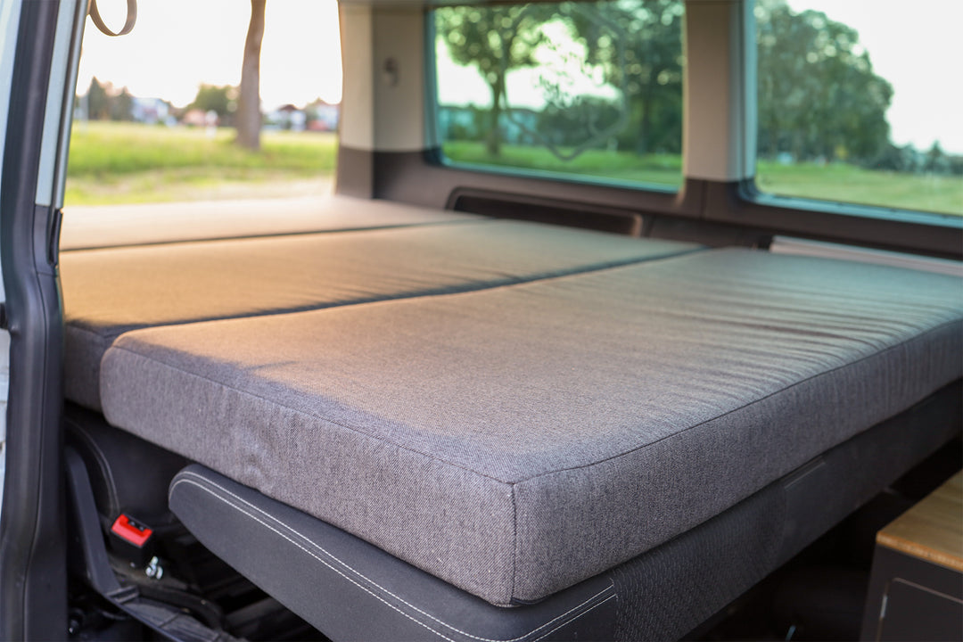 Zusammen mit der umgeklappten 3er Rücksitzbank und der Heckküche entsteht eine ebene Liegefläche. Die dreiteiligen Matratze (optional) aus Kaltschaum und Viskose sorgt für höchsten Schlafkomfort.