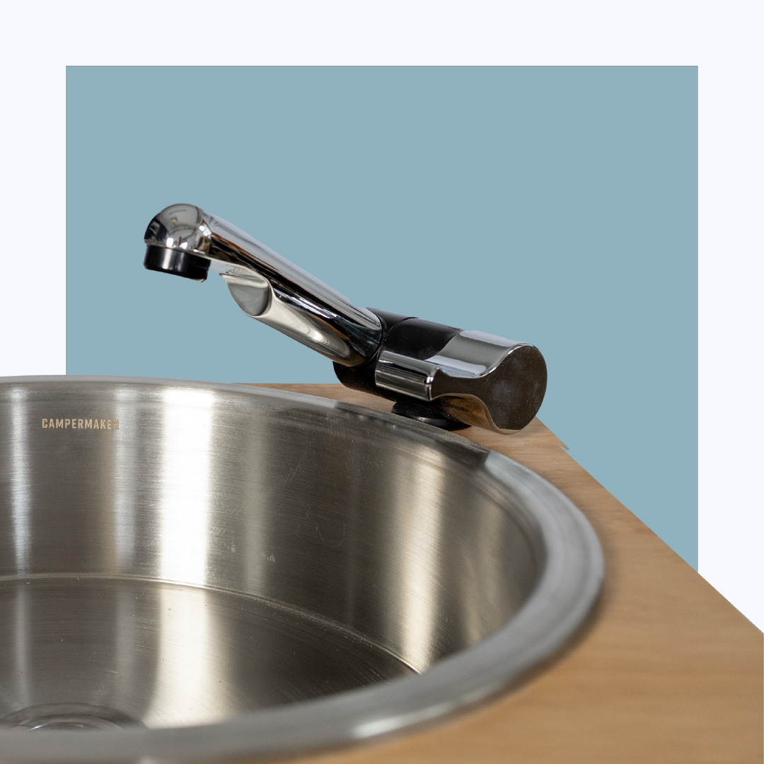 Die klassische Lösung mit Edelstahlspüle, 12 Liter Frisch- und Abwasser, klappbarem Wasserhahn optionaler Duschbrause. Die 12V Tauchpumpe bringt dafür auch den nötigen Wasserdruck.