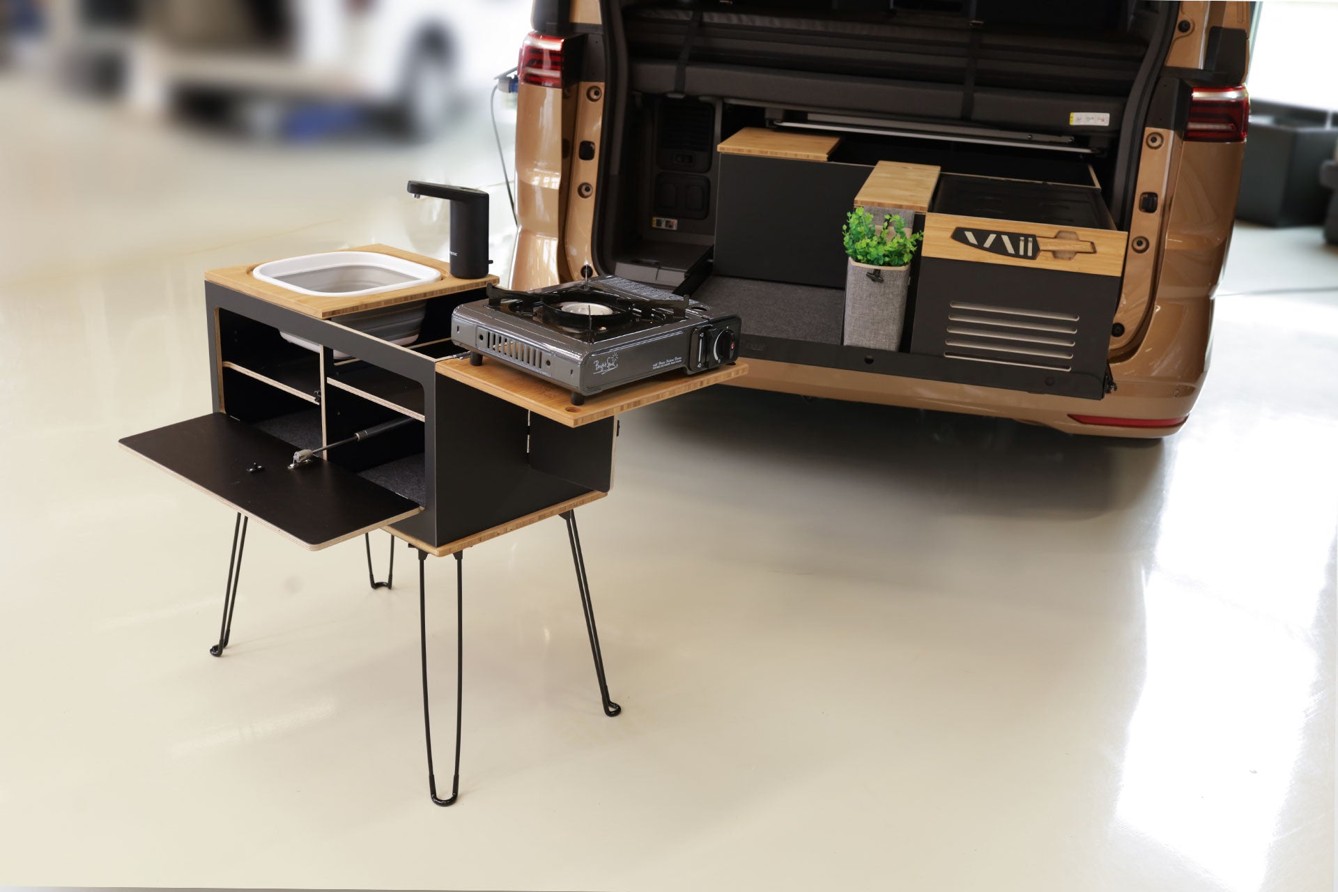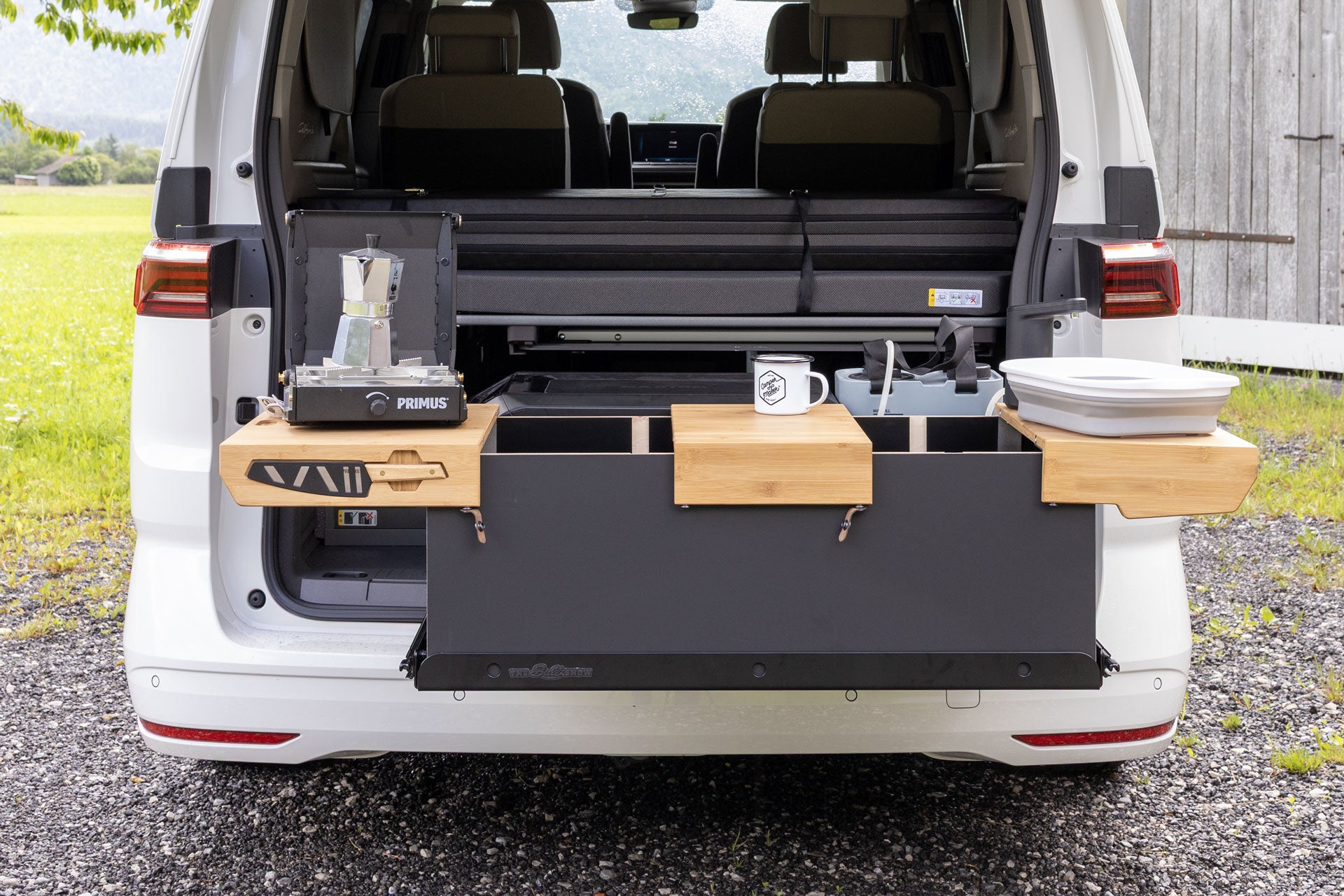 Die modulare Heckküche passt perfekt neben die Technikbox und unter die Original VW Heckablage. Der Heckauszug bietet Platz für individuell konfigurierbare Module, Gaskocher, Wasserversorgung und Kompressorkühlbox. Die herausnehmbaren Module können platzsparend verstaut oder als Outdoorküche unter der Markise verwendet werden.