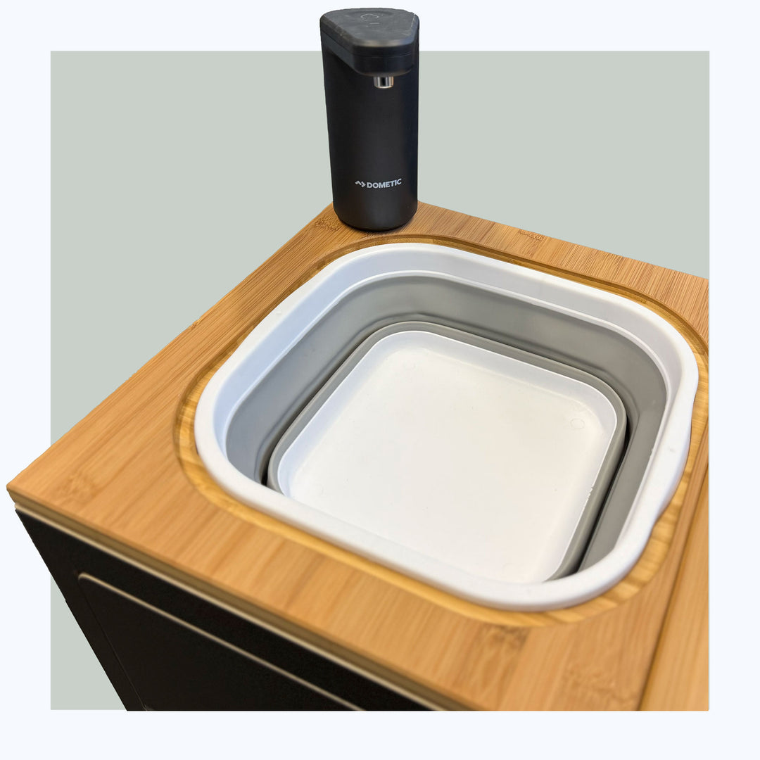 Das Frischwassersystem besteht aus einer herausnehmbaren Faltspüle, einem 12 Liter Frischwasserkanister und dem akkubetriebenem Wasserhahn Dometic Go. Unabhängig und mobil.
