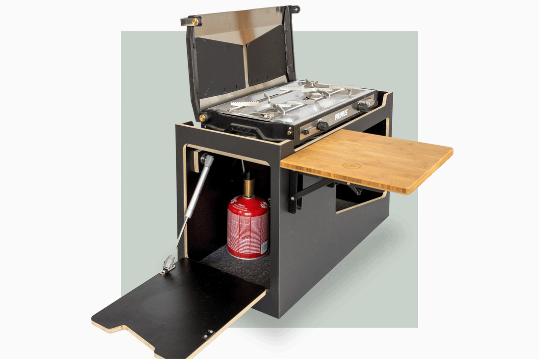 Schmales Modul mit herausnehmbaren Einleger für einen 2-Flammen Gaskocher (z.B. Primus Tupike). Seitlicher Bambus-Klapptisch und eine abnehmbare Bambus-Arbeitsplatten, da das Modul auch ohne Kocher als reines Stauraum-Modul verwendet werden kann. Staufach mit Klappe und zusätzliche seitliche Öffnung mit großem Staufach unter dem Kocher.
