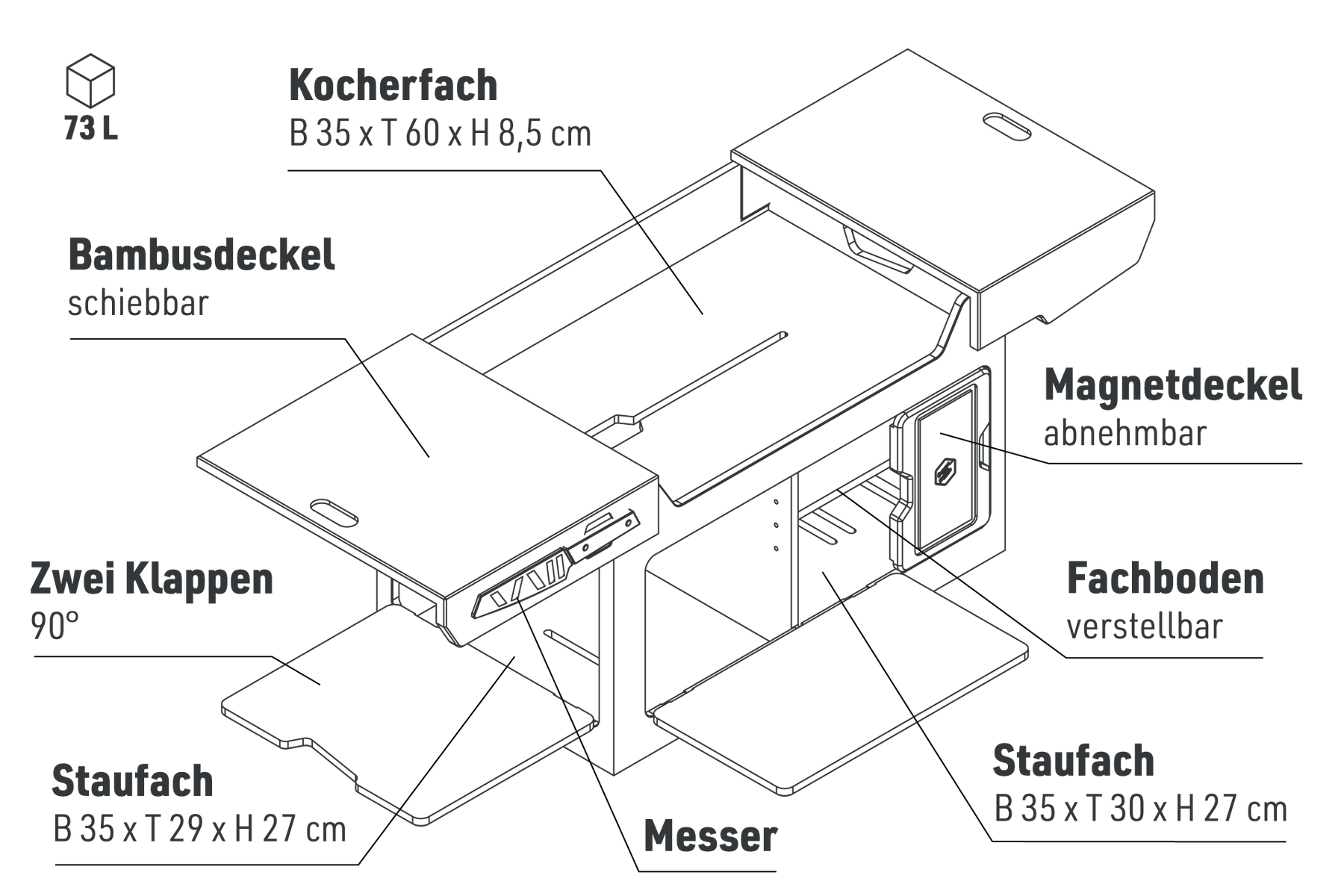 Das kompakte Kochermodul bietet alles, was du zum Kochen brauchst. Ausziehbare Arbeits- und Ablageflächen, Staufächer für Kochutensilien und Platz für 2-Flammenkocher (optional). Das Küchenmodul hat Platz auf allen gängigen Heckauszügen oder kann am Schienensystem im Fahrzeug fixiert werden. Durch den optionalen Standfuß wird das Kochermodul zur Outdoorküche.