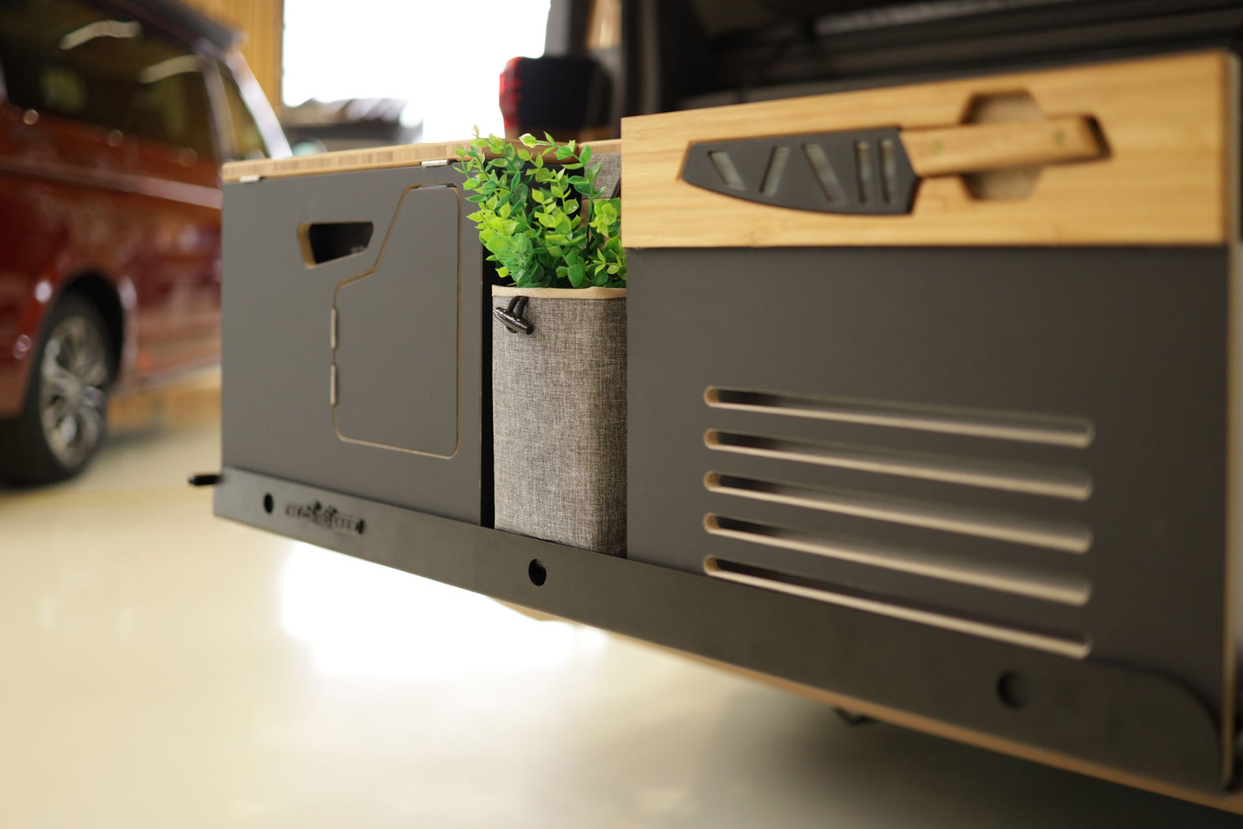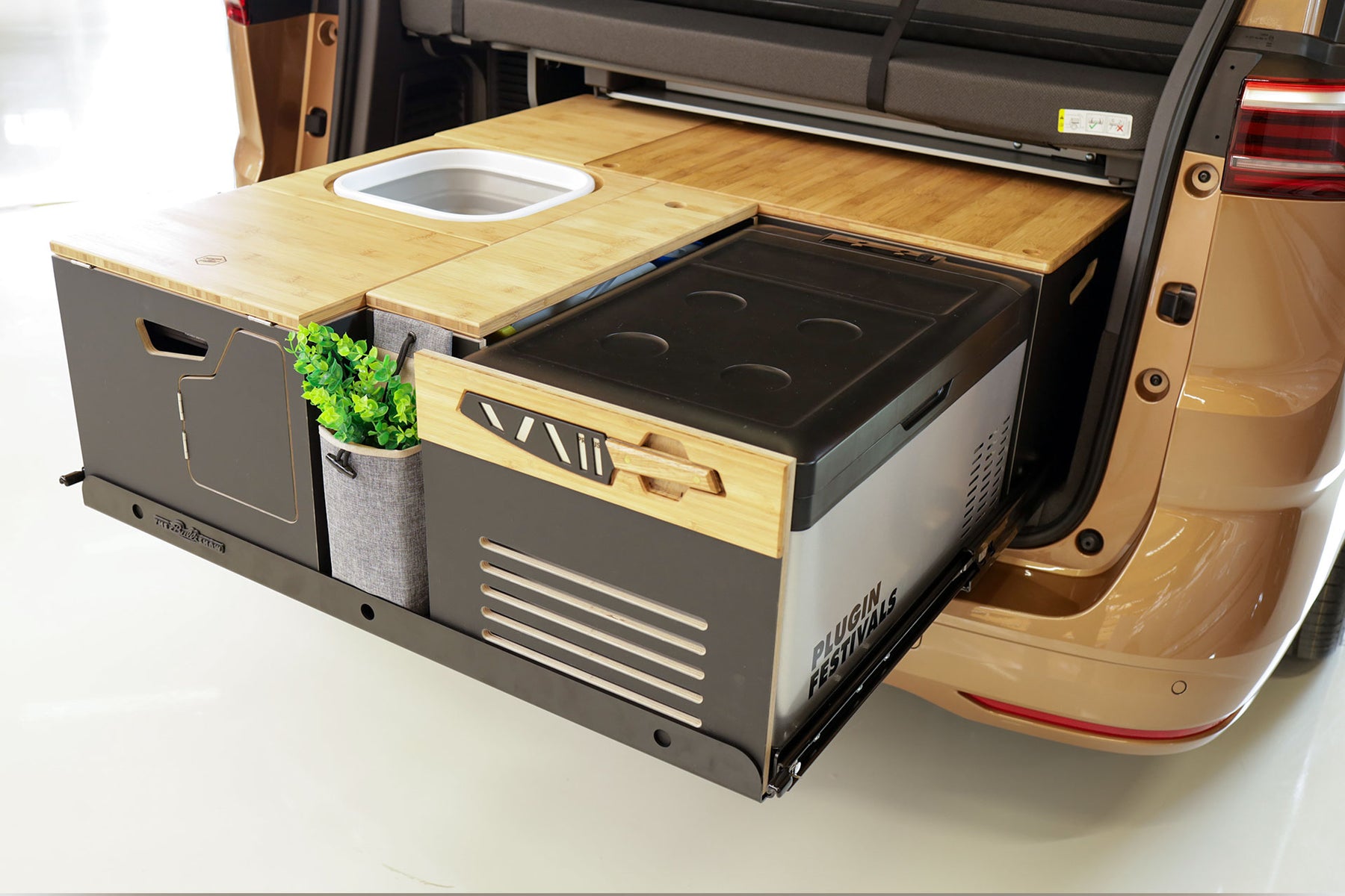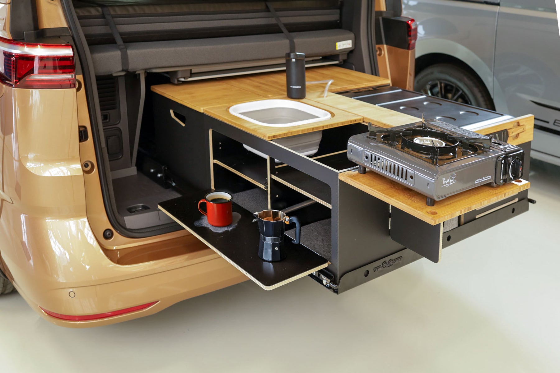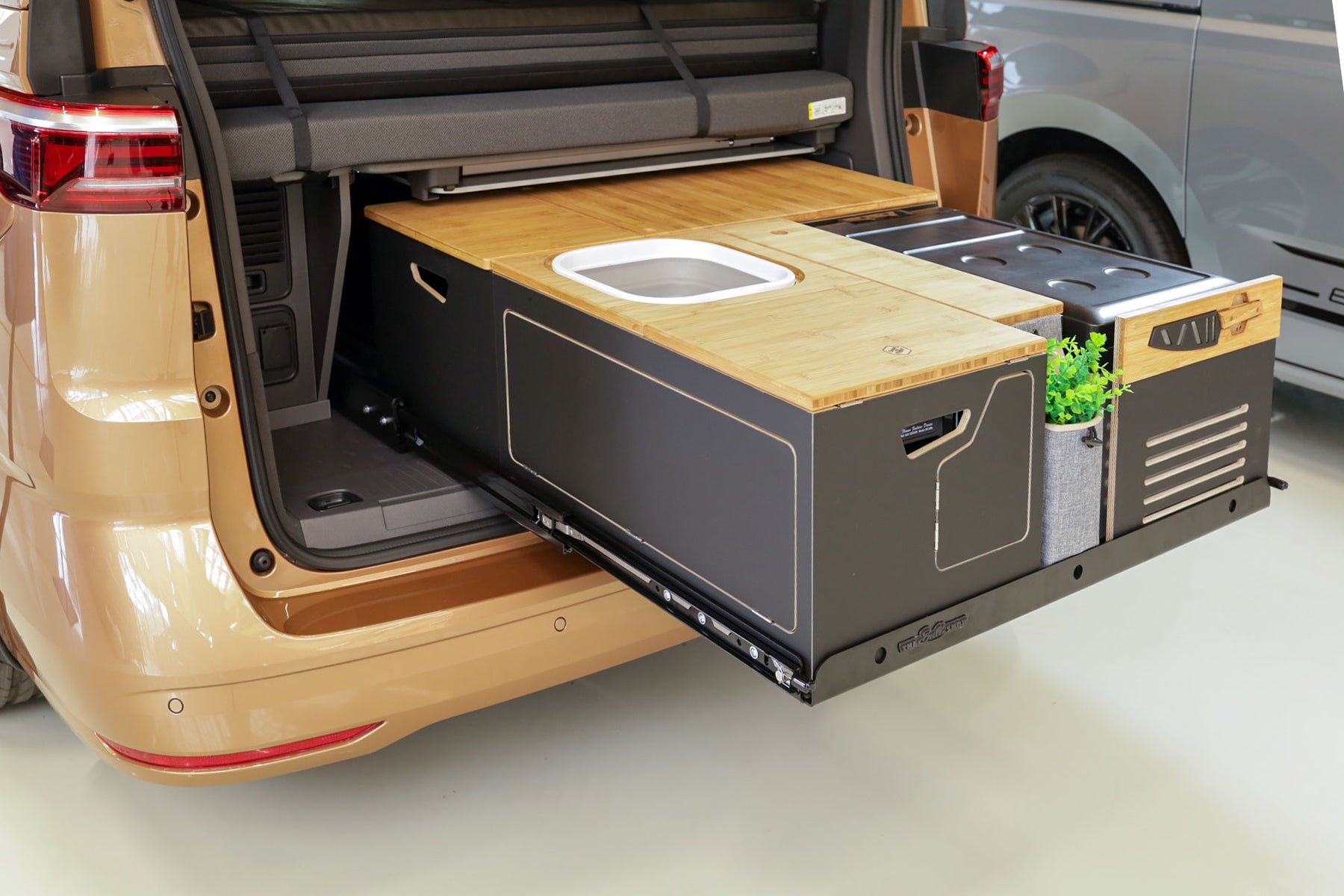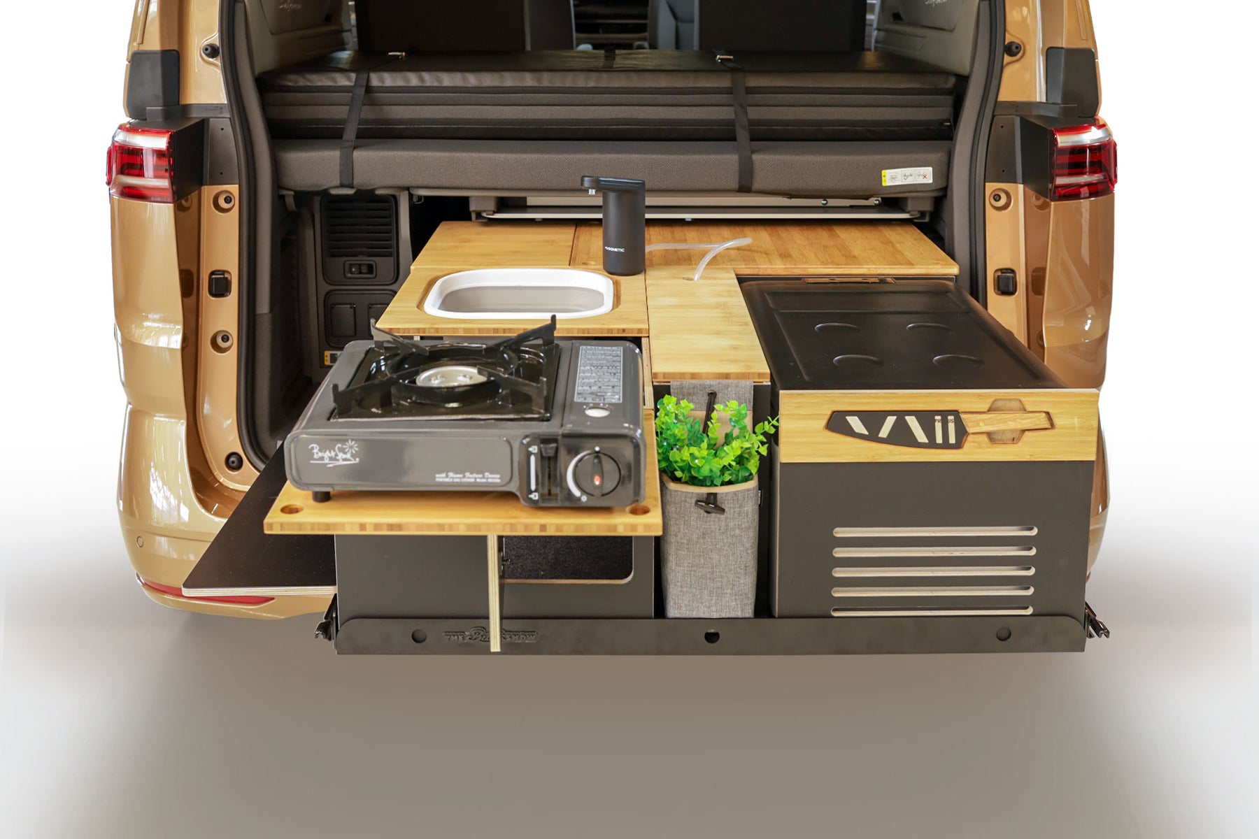 Die Samba New California Beach Tour besteht dem Koch- und Wassermodul, einem großen Stauraummodul (über die gesamte Breite) und einem kleinen Stauraummodul mit vantale Tasche in der Mitte (z.B. Platz für Frischwasserkanister). Daneben findet eine Kompressorkühlbox (z.B. Maentum IceCube 25 oder Maentum IceCubeX 25) Platz. Die Küche passt perfekt auf unseren (optionalen) Heckauszug. Das Koch- und Wassermodul kann optional mit dem Wassersystem Go (akkubetriebender Wasserhahn, Faltspüle und 12 L Frischwasserkanister) und einem 1- oder 2-Flammenkocher ausgestattet werden. Der optionale Modulständer macht das Koch- und Wassermodul im Handumdrehen zur Outdoorküche und kann zudem platzsparend als Deckel für das hintere Stauraummodul genutzt werden.