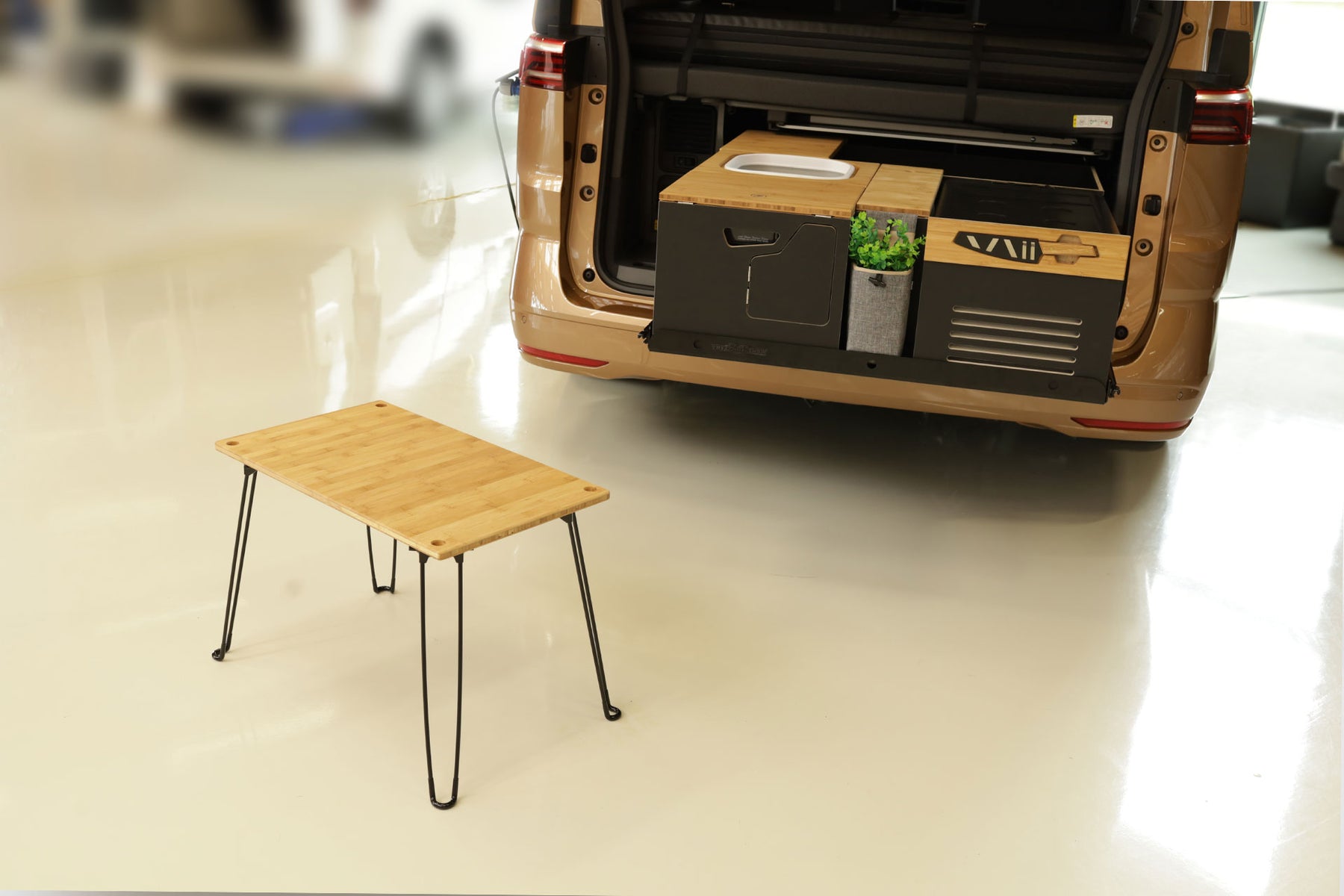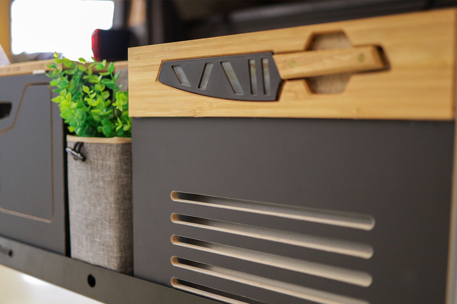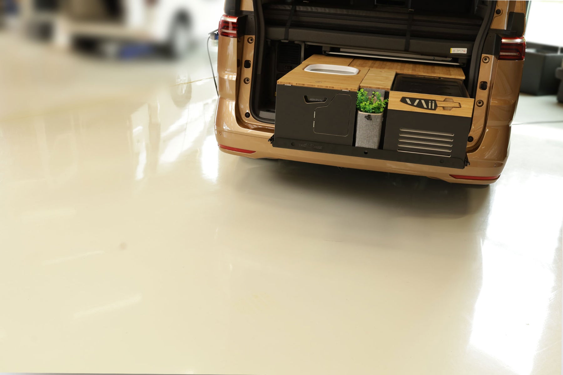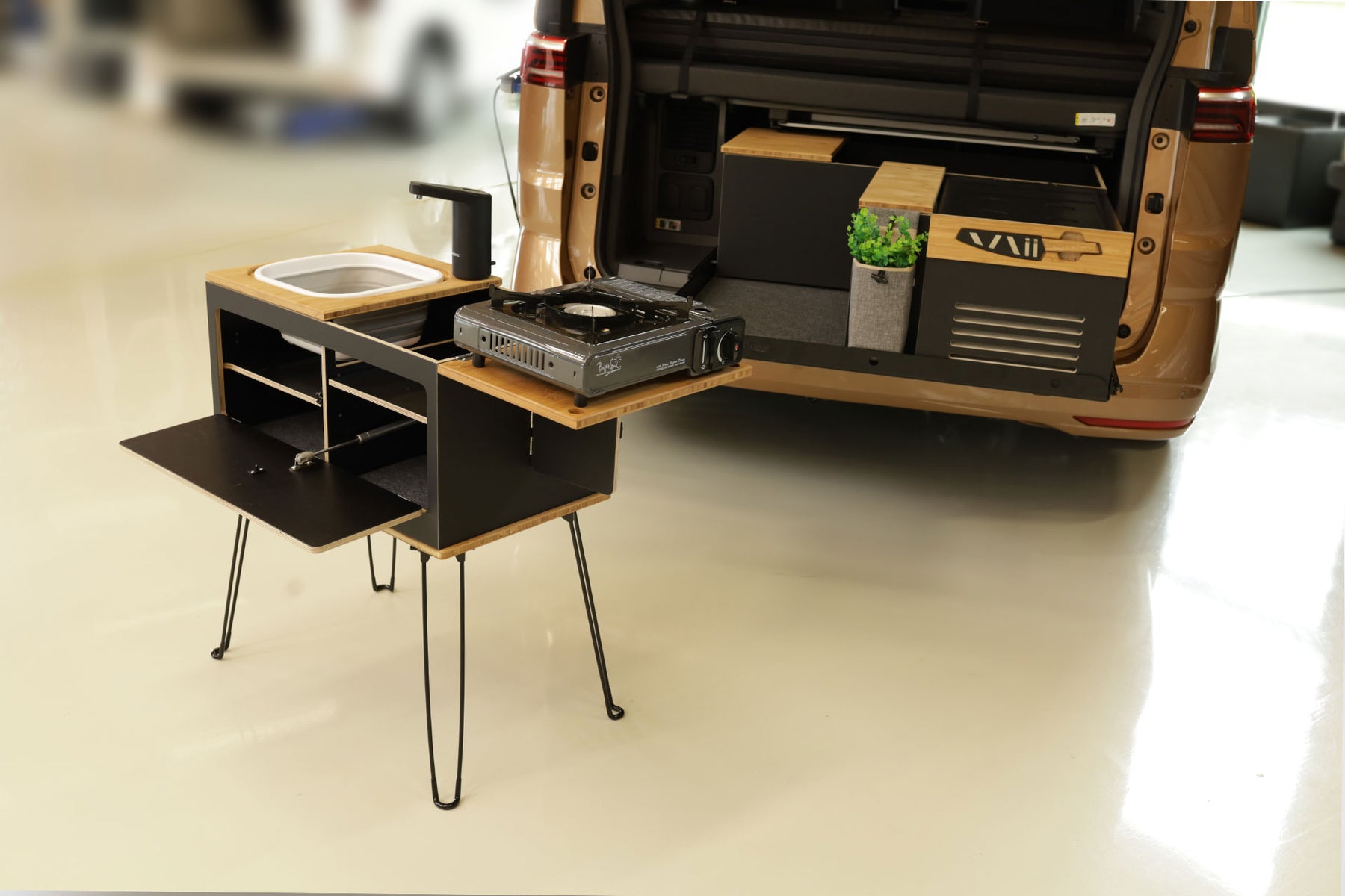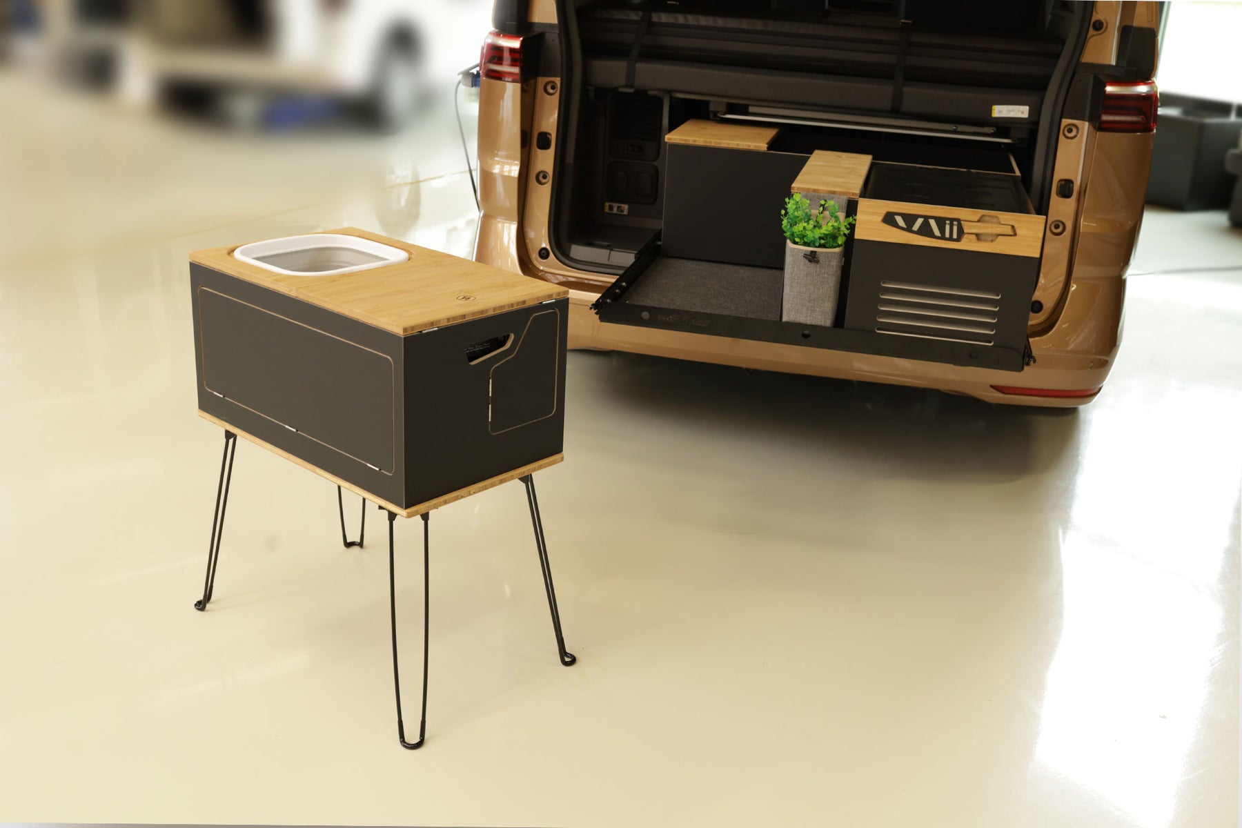Die Samba New California Beach Tour besteht dem Koch- und Wassermodul, einem großen Stauraummodul (über die gesamte Breite) und einem kleinen Stauraummodul mit vantale Tasche in der Mitte (z.B. Platz für Frischwasserkanister). Daneben findet eine Kompressorkühlbox (z.B. Maentum IceCube 25 oder Maentum IceCubeX 25) Platz. Die Küche passt perfekt auf unseren (optionalen) Heckauszug. Das Koch- und Wassermodul kann optional mit dem Wassersystem Go (akkubetriebender Wasserhahn, Faltspüle und 12 L Frischwasserkanister) und einem 1- oder 2-Flammenkocher ausgestattet werden. Der optionale Modulständer macht das Koch- und Wassermodul im Handumdrehen zur Outdoorküche und kann zudem platzsparend als Deckel für das hintere Stauraummodul genutzt werden.