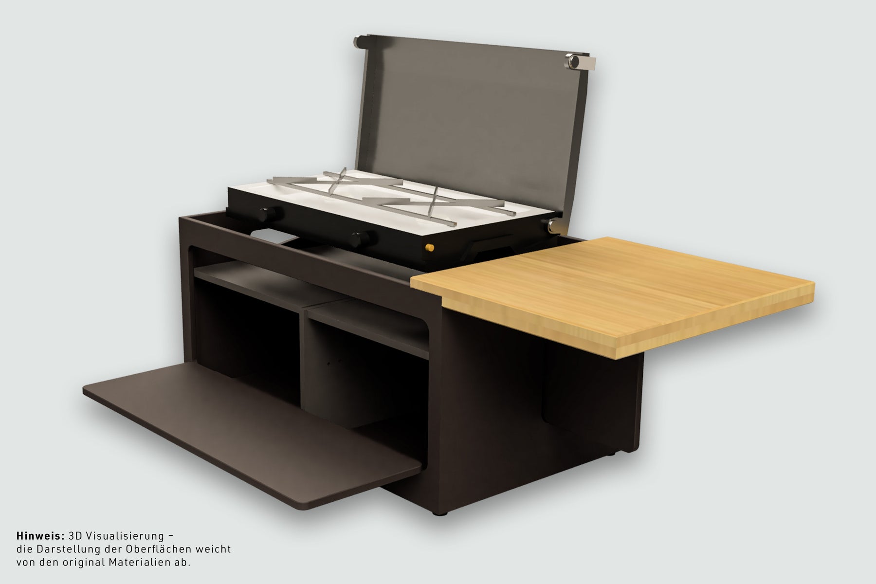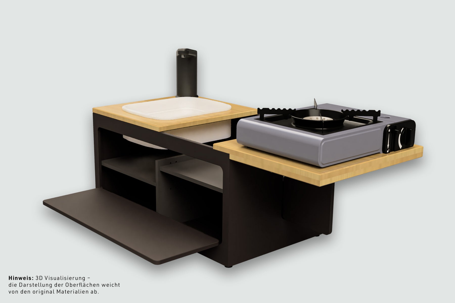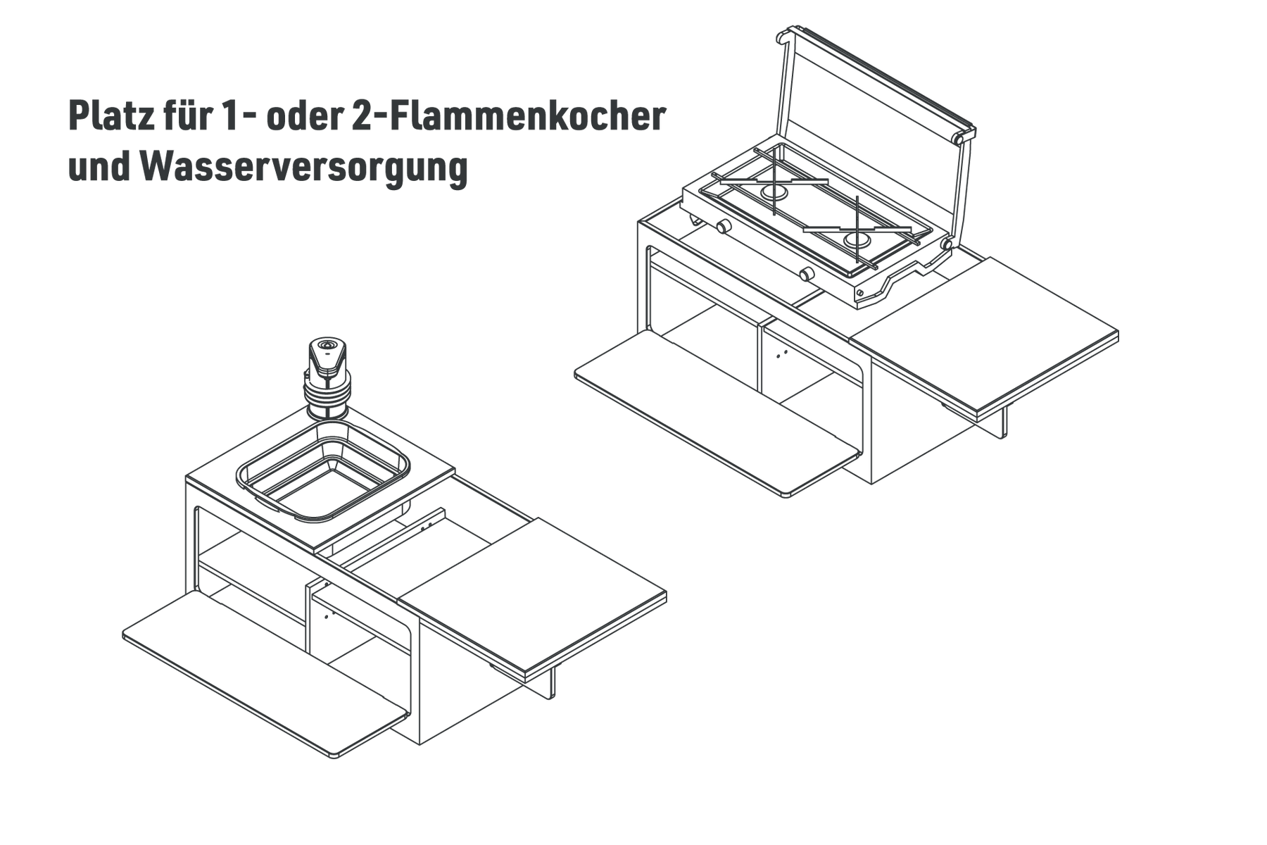 Das kompakte Modul kann mit 1- oder 2-Flammenkocher und Wasserversorgung ausgestattet werden. Mit nützlichen Klappen, Aufklapptisch und Staufächern. Auch als Outdoorküche nutzbar.