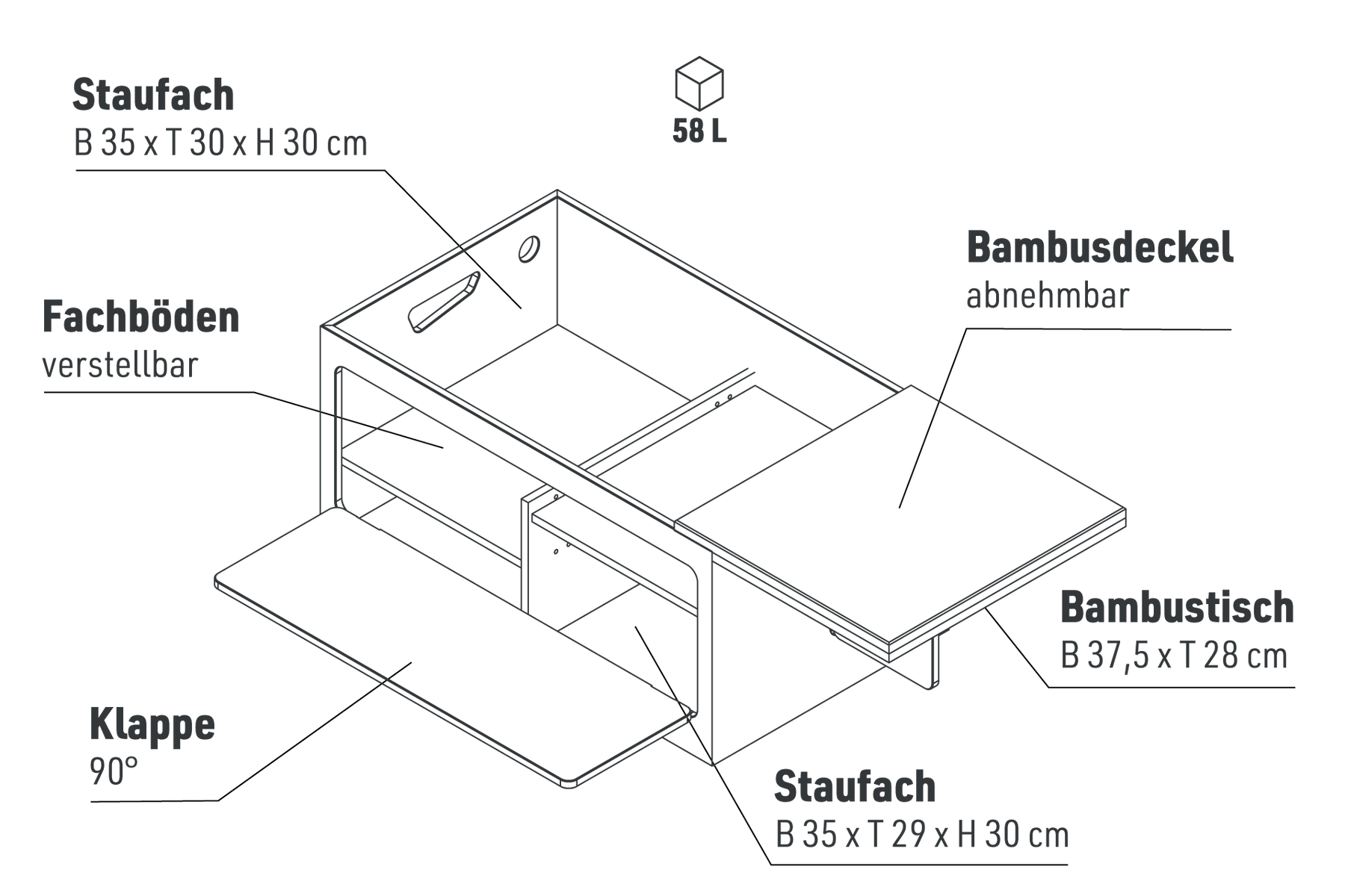 Modul mit Bambus Abdeckungen, Bambus Aufklapptisch, herausnehmbare und versetzbare Fachböden. Dekoartikel NICHT im Lieferumfang.
