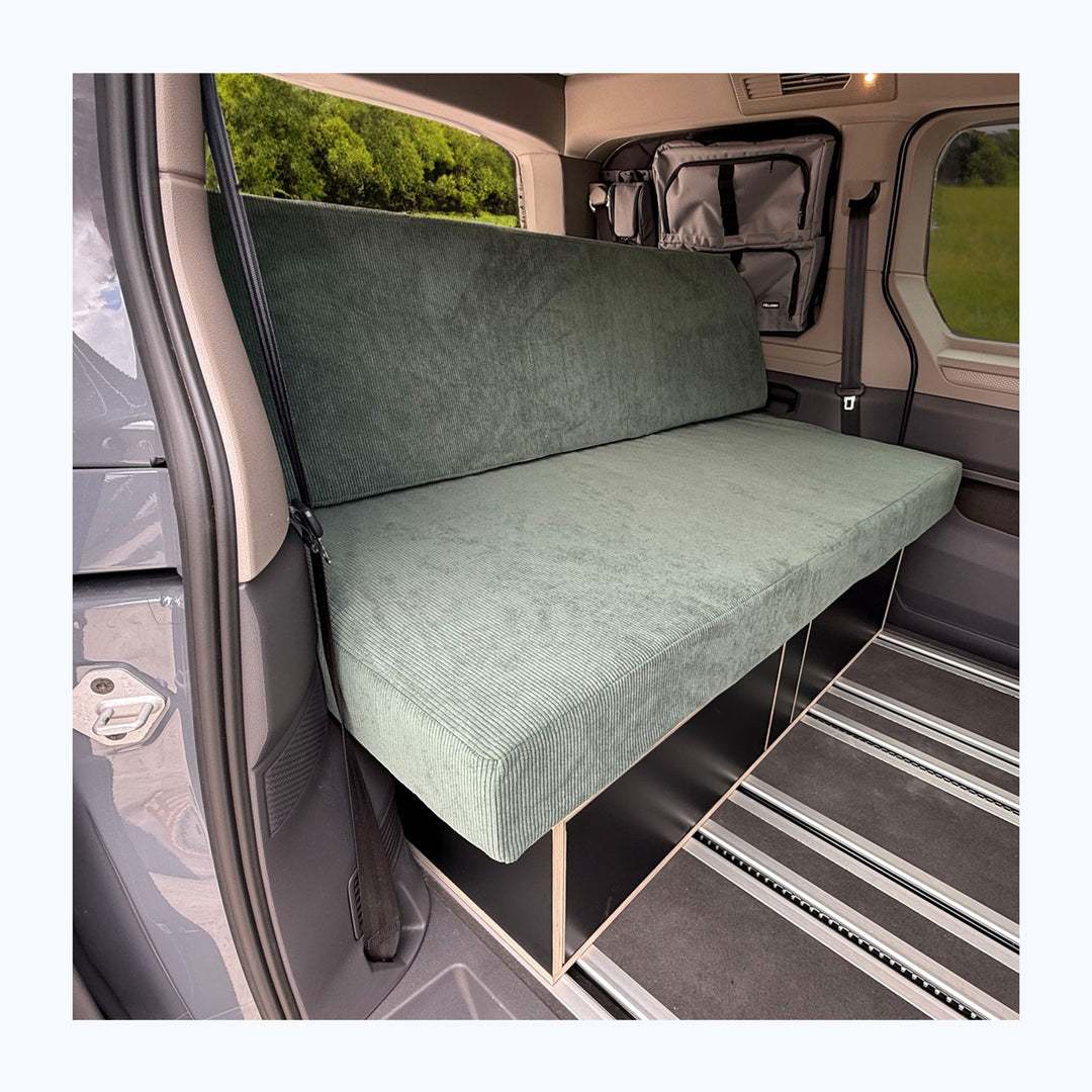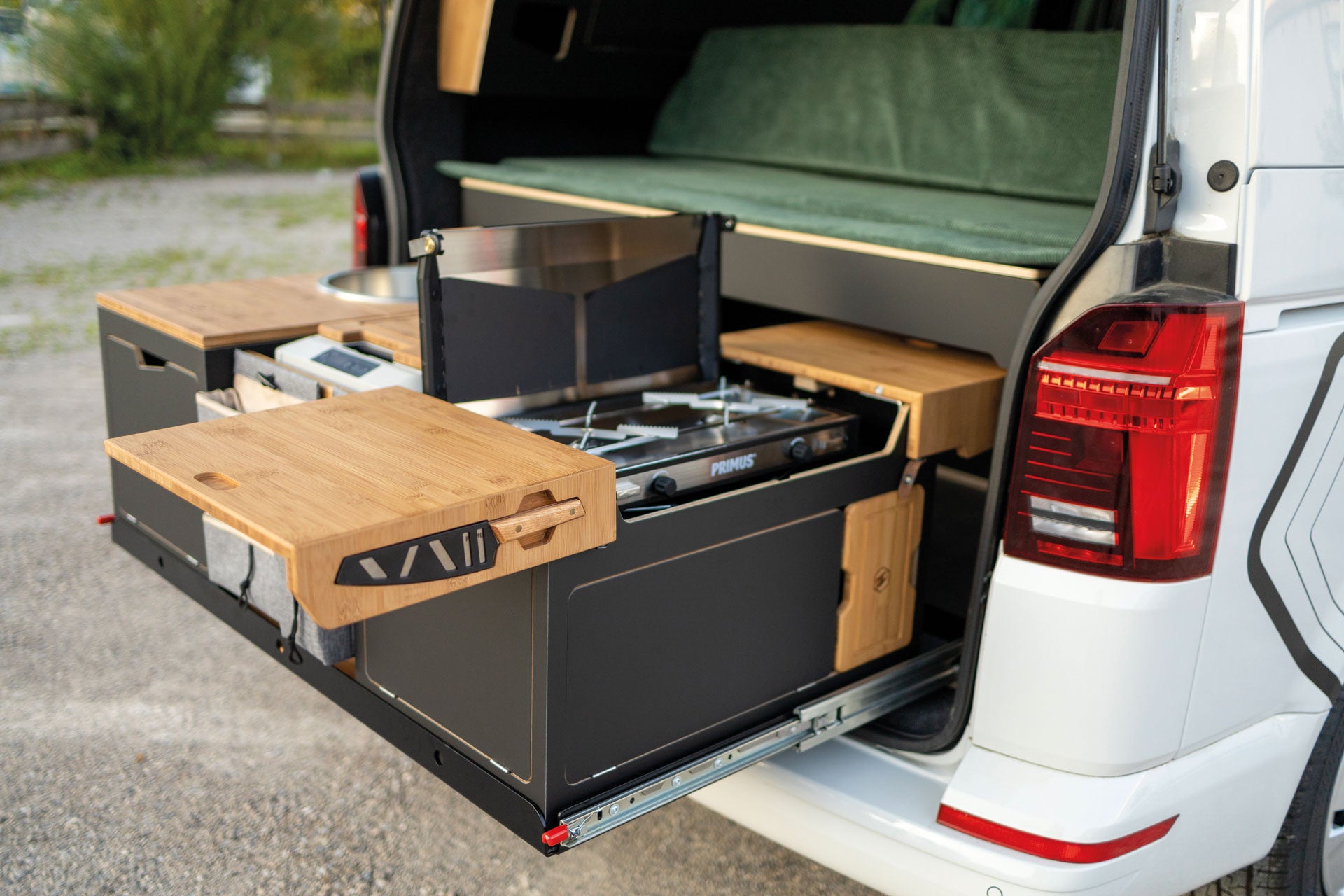 Die Vanlife Lösung vereint Küche, Wohn- und Schlafsystem in einem. Das Sofa lässt sich im Handumdrehen zum Bett ausziehen. Die Liefgefläche nutzt die gesamte Fahrzeugbreite. Der Heckauszug bietet Platz für individuell konfigurierbare Module, Gaskocher, Wasserversorgung und Kompressorkühlbox. Das Bettsystem ist zweiteilig, im Alltag kann beispielsweise die Heckablage mit -auszug in Kombination mit Einzelsitzen genutzt werden.