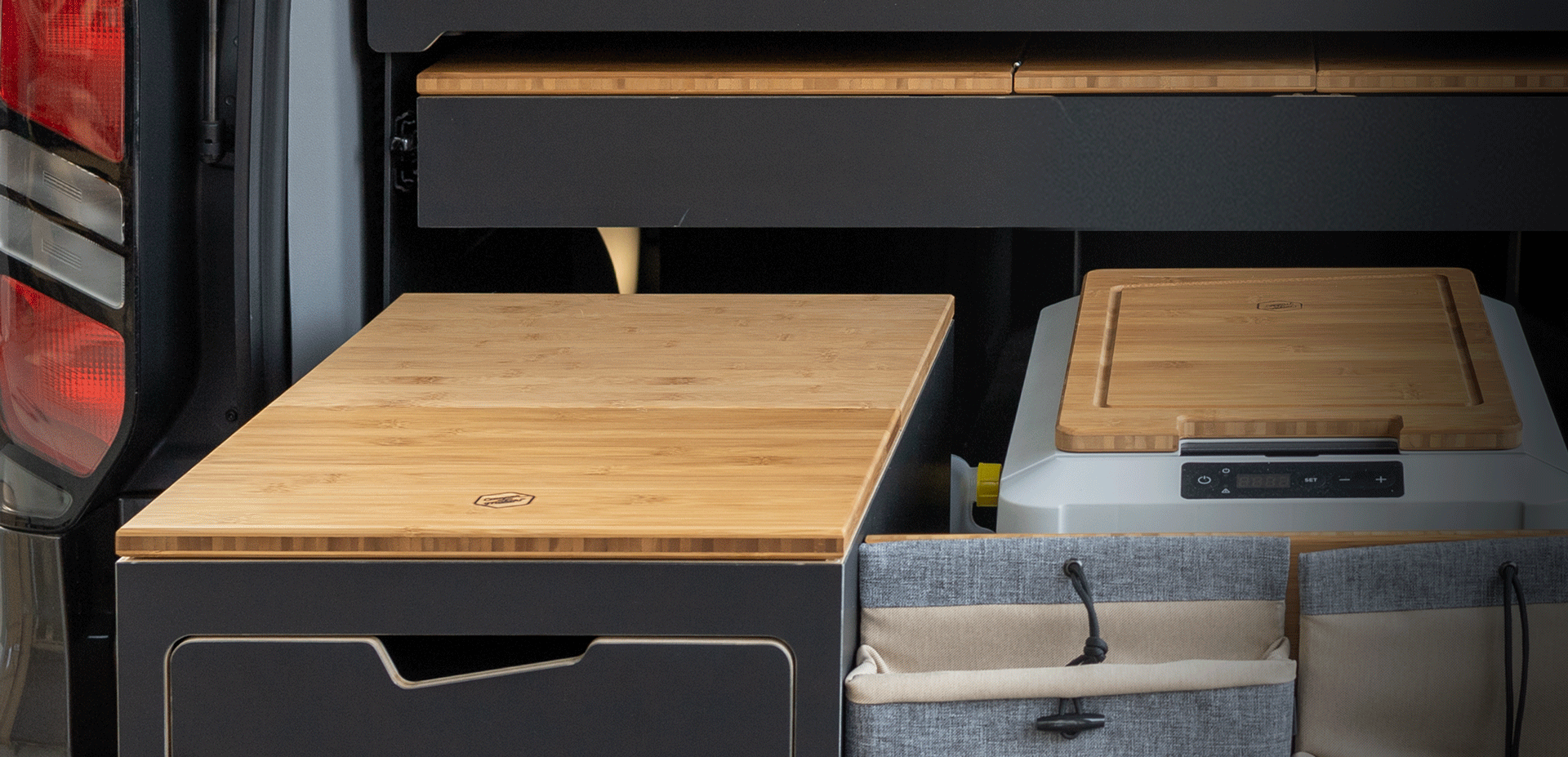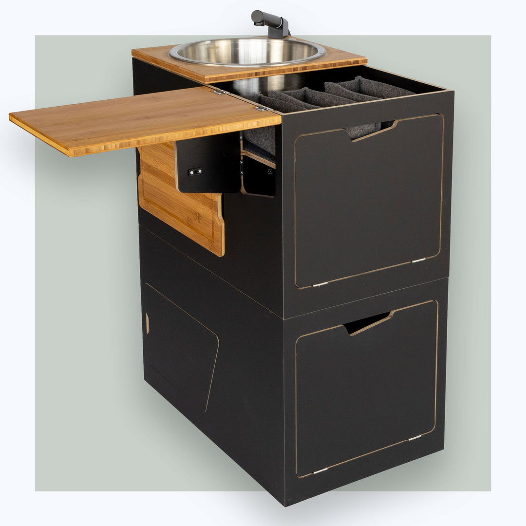 Raum für Wasserversorgung, Kocher, Vorräte, Geschirr, Besteck in einem Modul. Mit nützlichen Klappen, Fächern, Bambus Oberflächen, Schneidebrettern und Aufklapptisch. Mehr