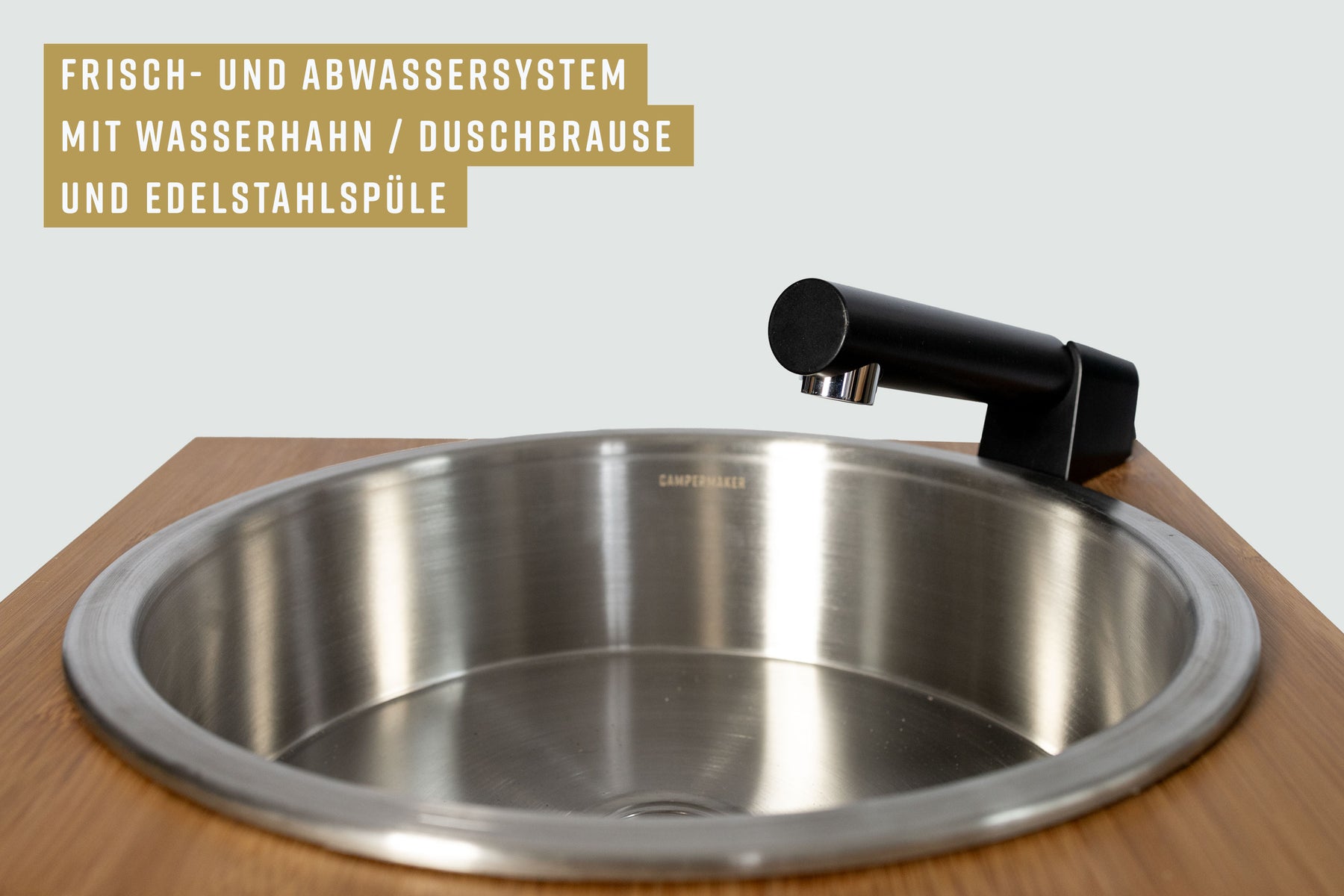 Frisch- und Abwassersystem: Die Premium Lösung mit Edelstahlspüle, 12 Liter Frisch- und Abwasser, abnehmbarem Wasserhahn und integrierter Duschbrause. Die 12V Tauchpumpe bringt dafür auch den nötigen Wasserdruck. Vorteil: saubere Abwasserlösung, integrierte Dusche, Edelstahlspüle, höherer Wasserdruck