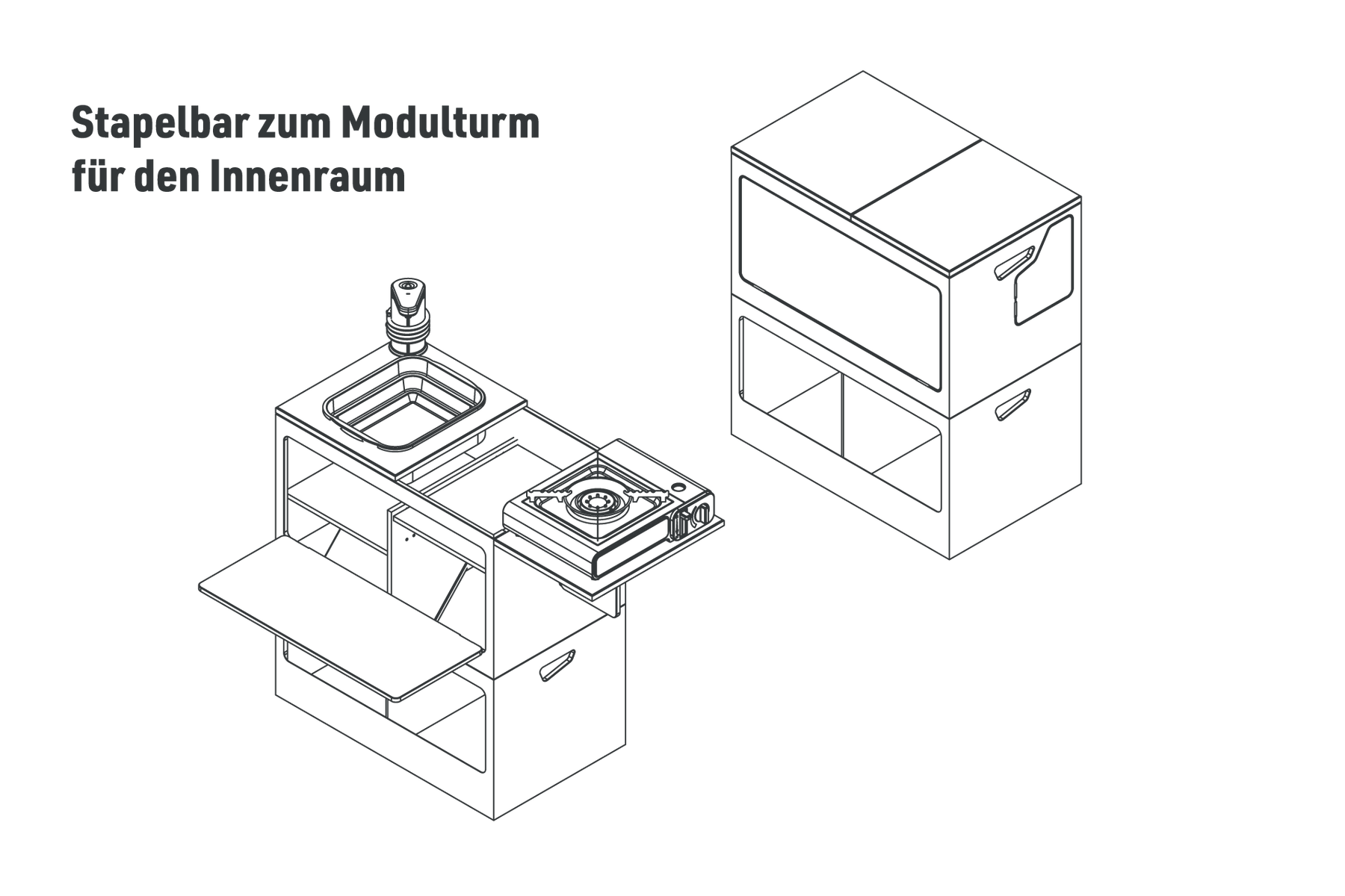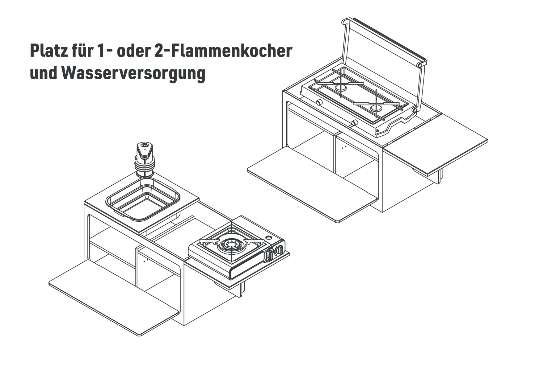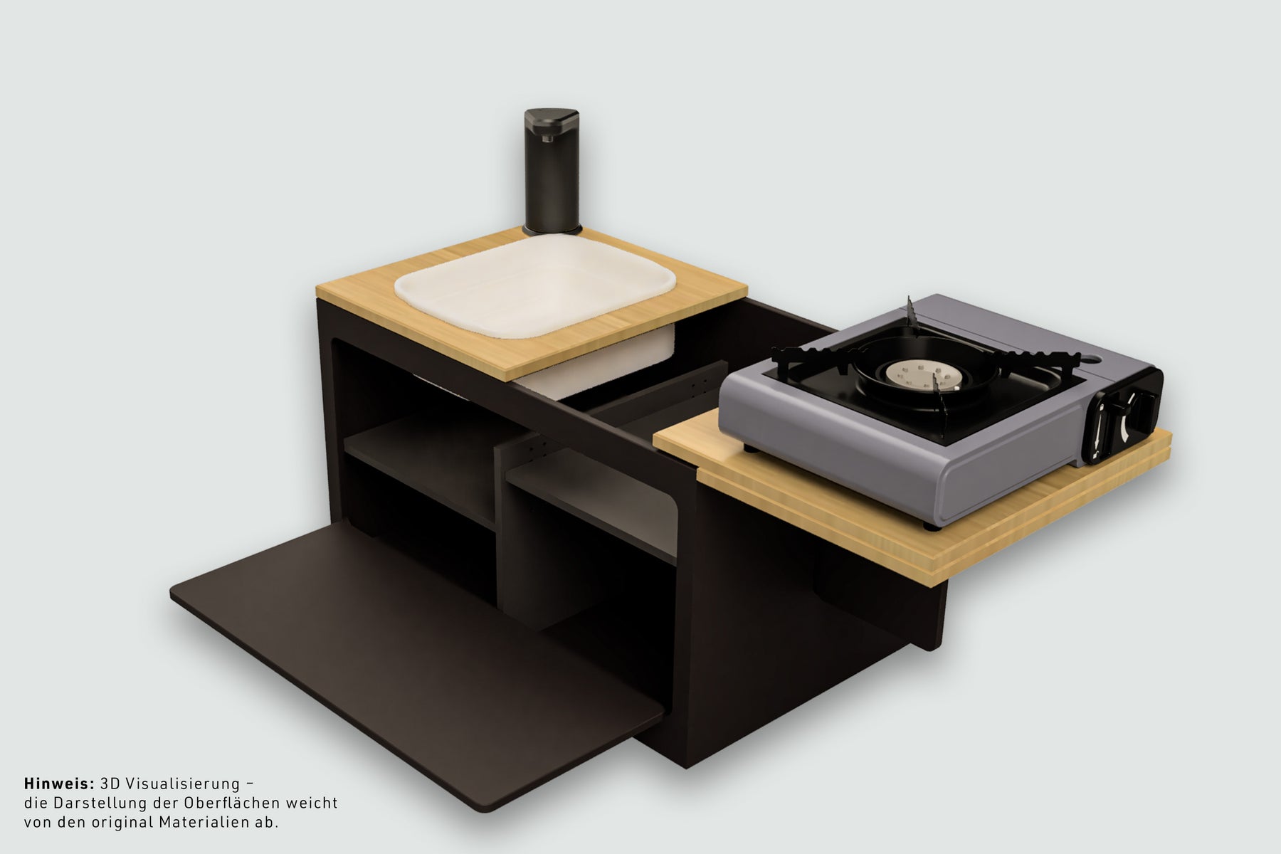 Modul mit großem Staufach mit Tür, ein Fach für Besteck oder Gaskocher, ein Fach für Abwasserkanister, eine aufklappbare Bambusplatte. Es sind zwei verschiedene Wasseroptionen möglich. 12V Stromversorgung über komfortable Magnetstecker und Filzeinlagen für klapperfreies Verstauen. Dieses Modul kann auf andere Module gestapelt und miteinander bzw. am Schienensystem fixieren.