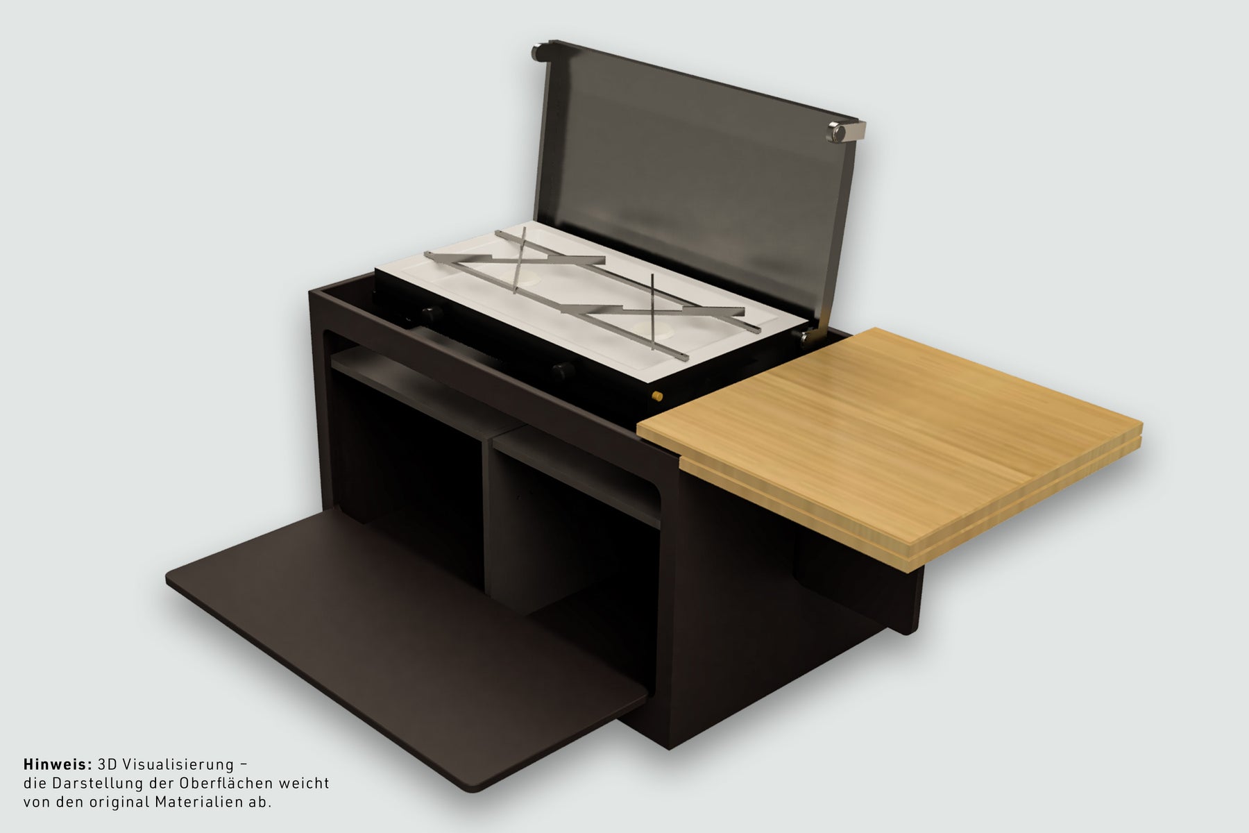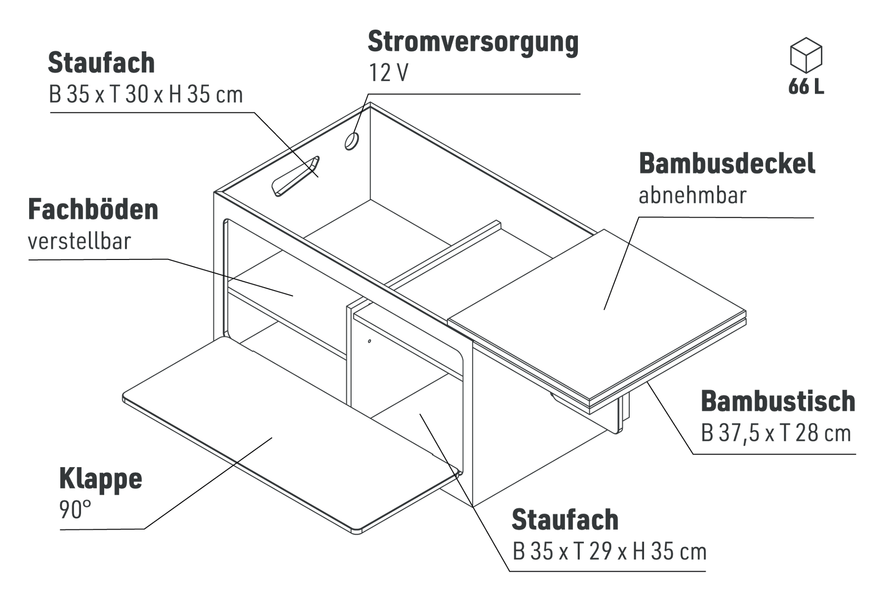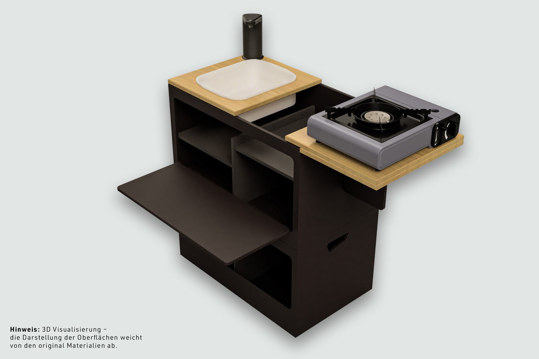 Modul mit großem Staufach mit Tür, ein Fach für Besteck oder Gaskocher, ein Fach für Abwasserkanister, eine aufklappbare Bambusplatte. Es sind zwei verschiedene Wasseroptionen möglich. 12V Stromversorgung über komfortable Magnetstecker und Filzeinlagen für klapperfreies Verstauen. Dieses Modul kann auf andere Module gestapelt und miteinander bzw. am Schienensystem fixieren.