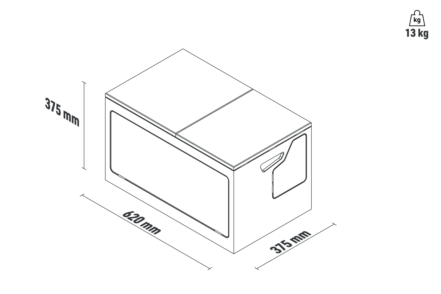 Außenmaße: B 37,5 x T 62 x H 40 cm Kocherfach: B 35 x T 29 x H 10 cm Staufach: B 35 x t 28 x H 22 cm Fach unter Spüle: B 35 x T 30 x H 33 cm Gewicht: 16 kg Stauvolumen: 73 L