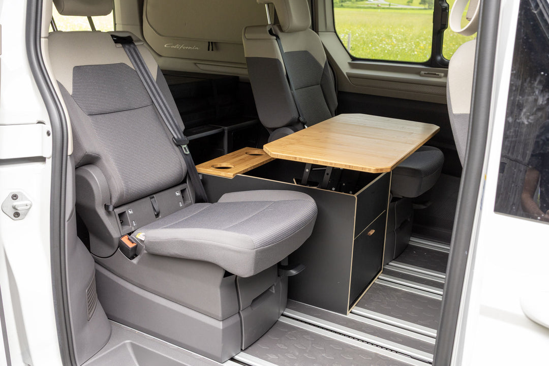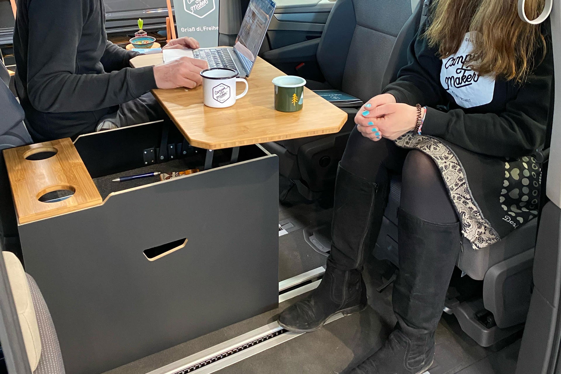Die Komplettlösung für den ID. Buzz (KR/LR) bietet ein Schlafsofa, dass im Handumdrehen zum Bett ausgezogen wird und tagsüber zum Relaxen einlädt oder auch zum Arbeiten am integrierten Tisch.