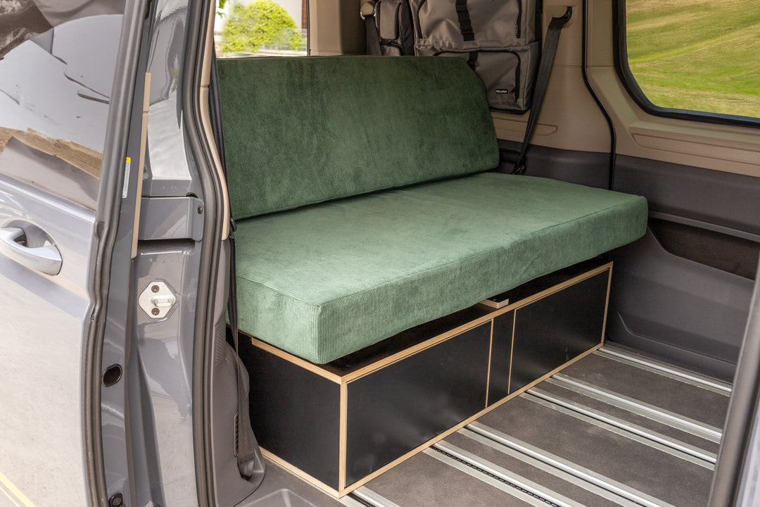 Sitze raus, Vanlife rein! Der schnellste Weg, um aus deinem Daily Driver einen Lifestyle Camper zu machen, wie es sonst nur mit langwierigen Ausbauprojekten möglich ist. Eine bequeme Couch mit tollen Cordbezügen, die sich im Handumdrehen zum Bett umklappen lässt und auf Wunsch die passende Küche unter der Heckklappe. Das am Schienensystem montierete Bettsystem ist zweigeteilt und kann somit in wenigen Minuten ein- und ausgebaut werden. (Verfügbar für VW T5/T6/T6.1/T7 Multivan/California Beach, Mercedes V-Klasse/Marco Polo Activity/Horizon, Ford Tourneo Custom)