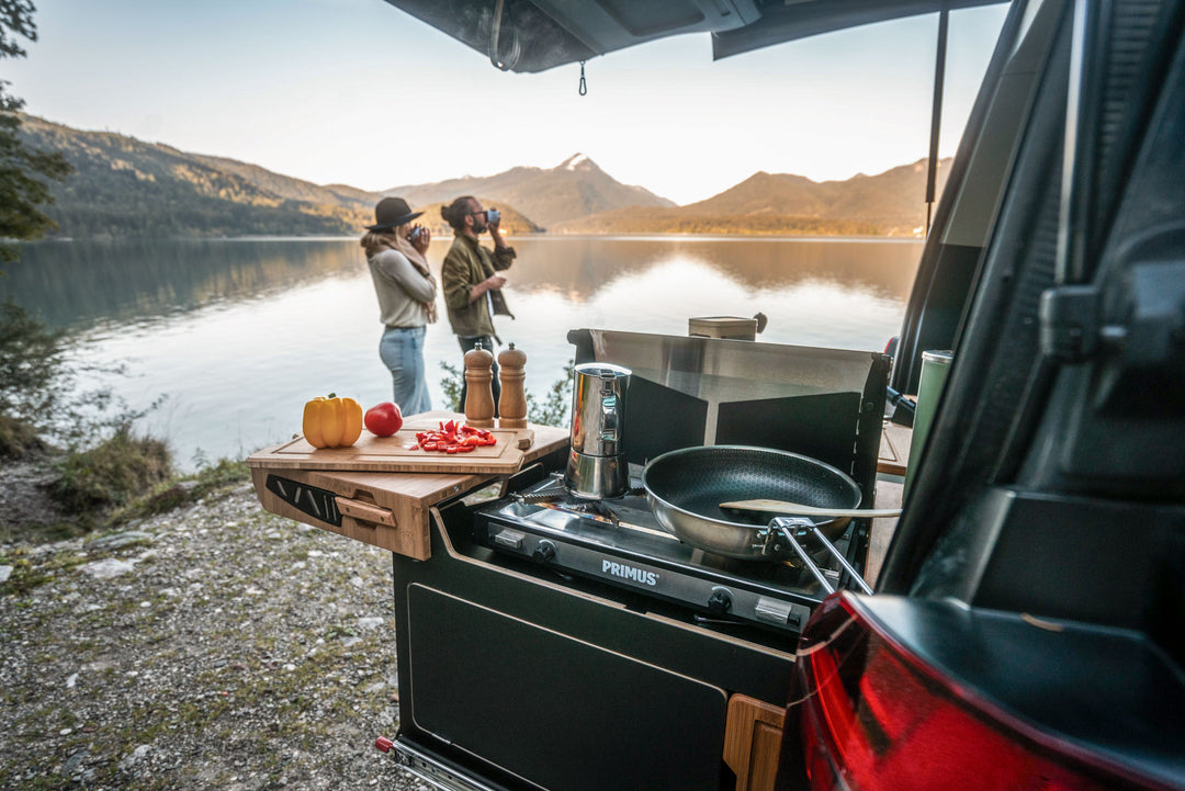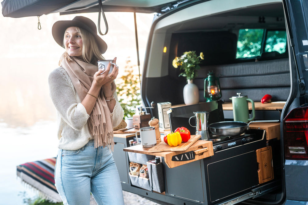 Maximale Flexibilität für Alltag und Freizeit. Die Module lassen sich beispielsweise als Heckküche auf einem Heckauszug, als Modulturm hinter dem Fahrersitz oder draußen unter der Markise nutzen. Im Alltag ist der Heckauszug auch ohne Module eine nützliche Transporthilfe für Einkäufe oder sperrige Gegenstände. (Verfügbar für VW T5/T6/T6.1 und T7 Multivan/California Beach, Mercedes Marco Polo Horizon/Activity, Pössl Vanstar, Ford Tourneo Custom und vanexxt)