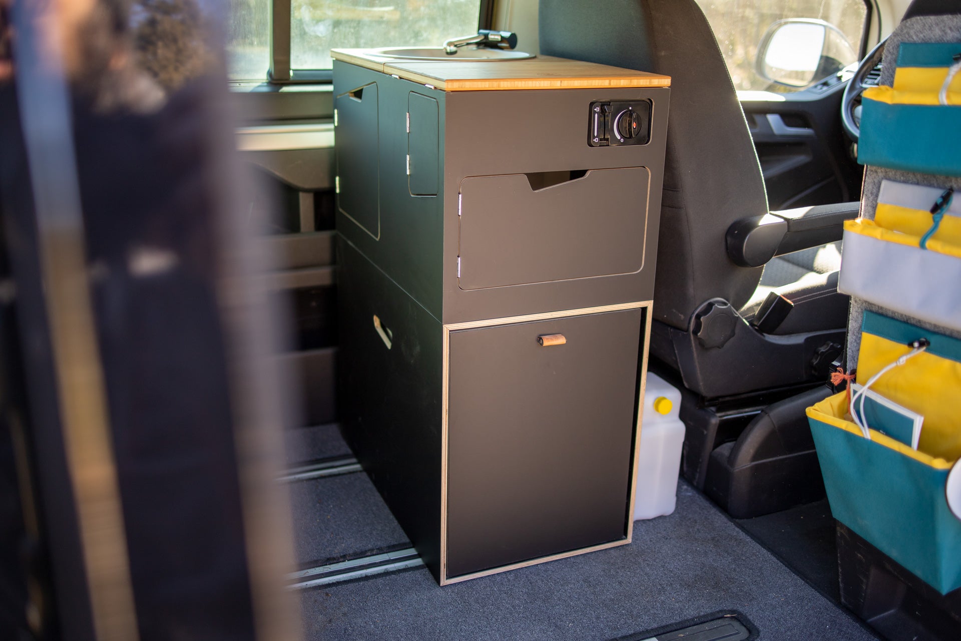 Sie bietet alles, was du zum Kochen brauchst. Ausziehbare Arbeits- und Ablageflächen, Schneidebrettl, Staufächer für Kochutensilien und Platz für einen 2-Flammenkocher (optional). Der Standfuß lässt sich platzsparend zusammenlegen. Die Küche hat Platz auf allen gängigen Heckauszügen oder kann am Schienensystem im Fahrzeug fixiert werden. Mehr