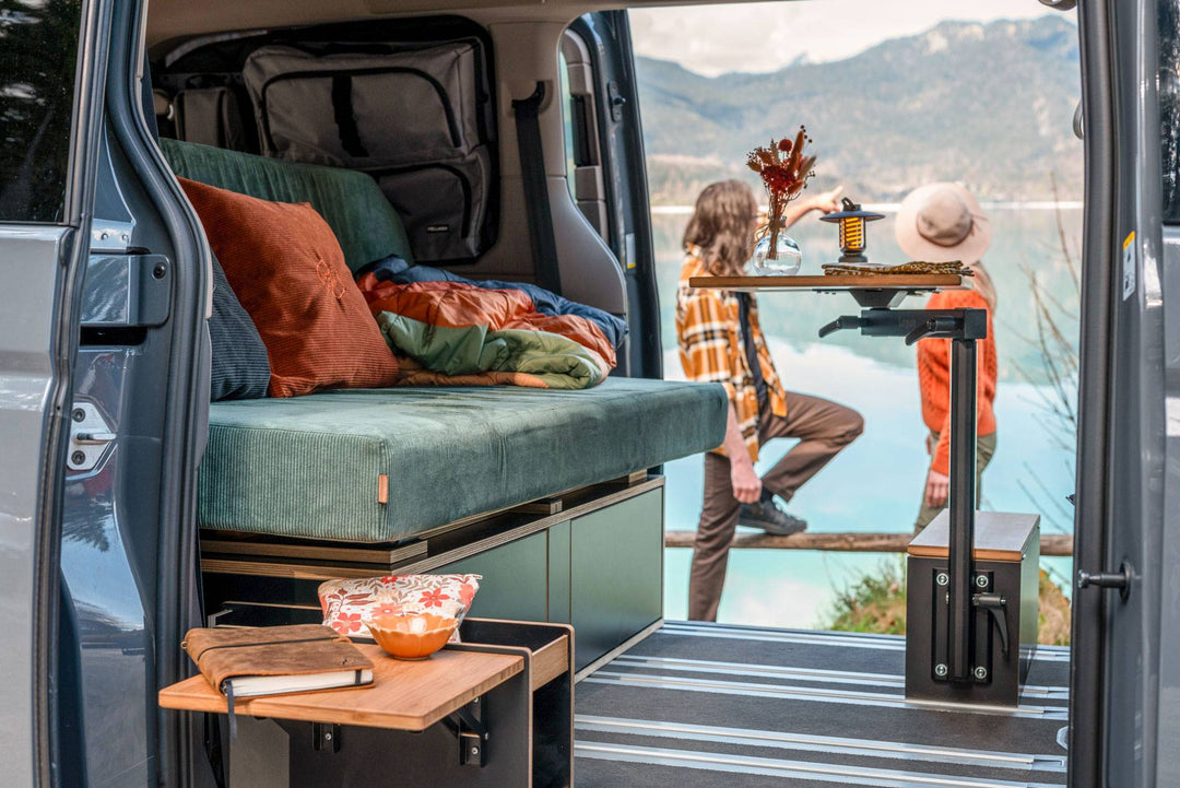 Sitze raus, Vanlife rein! Der schnellste Weg, um aus deinem Daily Driver einen Lifestyle Camper zu machen, wie es sonst nur mit langwierigen Ausbauprojekten möglich ist. Eine bequeme Couch mit tollen Cordbezügen, die sich im Handumdrehen zum Bett umklappen lässt und auf Wunsch die passende Küche unter der Heckklappe. Das am Schienensystem montierete Bettsystem ist zweigeteilt und kann somit in wenigen Minuten ein- und ausgebaut werden. (Verfügbar für VW T5/T6/T6.1/T7 Multivan/California Beach, Mercedes V-Klasse/Marco Polo Activity/Horizon, Ford Tourneo Custom)