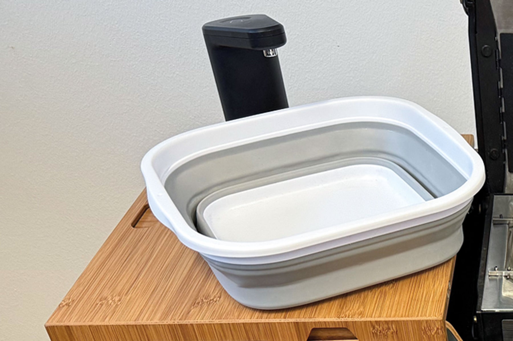 bestehend aus Faltspüle, Bambus Abdeckung bzw. Schneidebrett für Faltspüle, Dometic Go Wasserhahn akkubetrieben und 11 Liter Dometic Go Wasserbehälter.